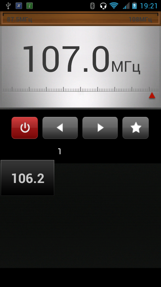Программа управления FM-радиоприемником имеет нестандартный внешний вид, основные элементы управления собраны в верхней части экрана, остальная площадь отведена под список любимых радиостанций. Доступны автоматический поиск станций и возможность ввести частоту вручную. Поддержка RDS и запись аудио отсутствуют. Качество приема сигнала FM-радиостанций среднее.