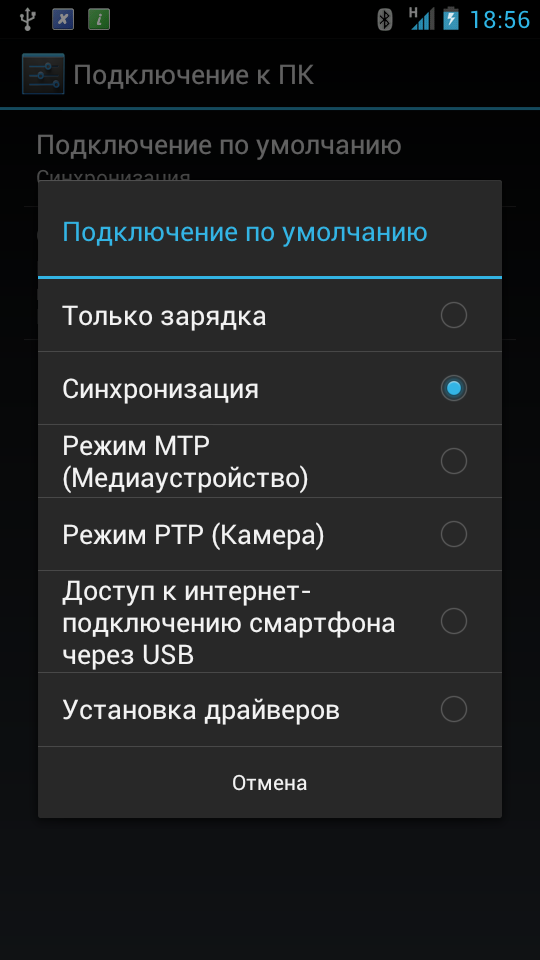 В настройках смартфона определенный интерес представляет вкладка с параметрами подключения устройства к USB-порту обычного компьютера. Пожалуй, это самые подробные настройки USB-соединения ПК и коммуникатора, на выбор предлагается множество вариантов поведения смартфона: только зарядка, синхронизация, режим MTP (медиаустройства), режим PTP (камеры), режим модема и установка драйверов. По умолчанию коммуникатор будет предлагать выбрать один из режимов каждый раз при его подключении к компьютеру, но это поведение можно изменить и выбрать один стандартный протокол.