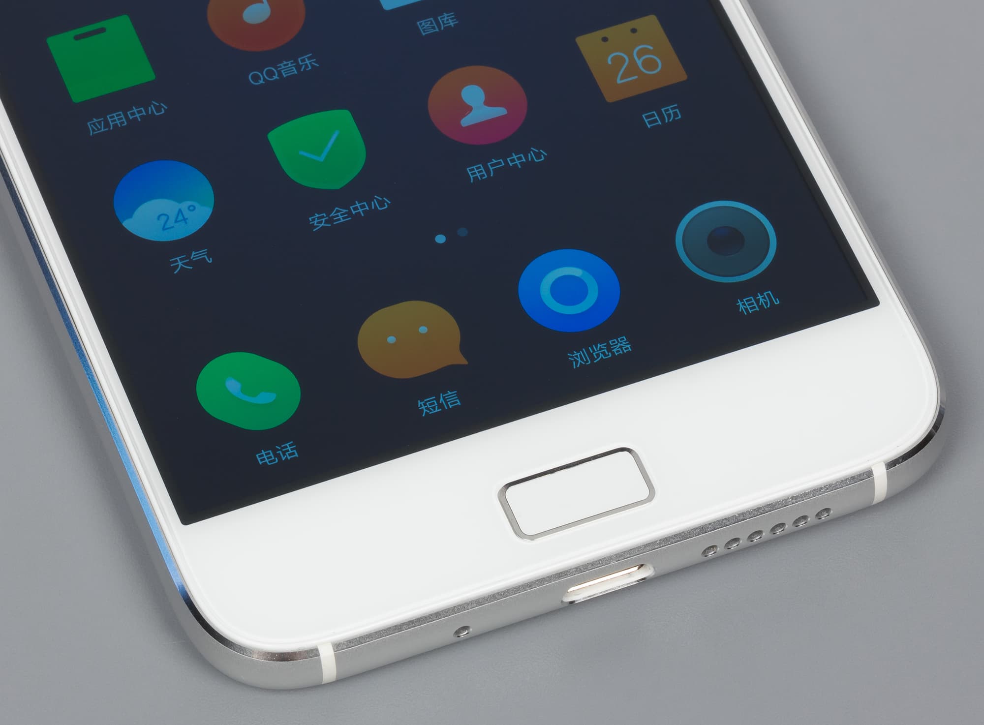 Передняя панель Zuk Z1 полностью прикрыта плоским защитным стеклом Gorilla Glass, не имеющим покатых краев или бортиков. Под стеклом скрывается полный набор знакомых элементов: сенсоры, глазок фронтальной камеры, светодиодный индикатор событий — все на месте.