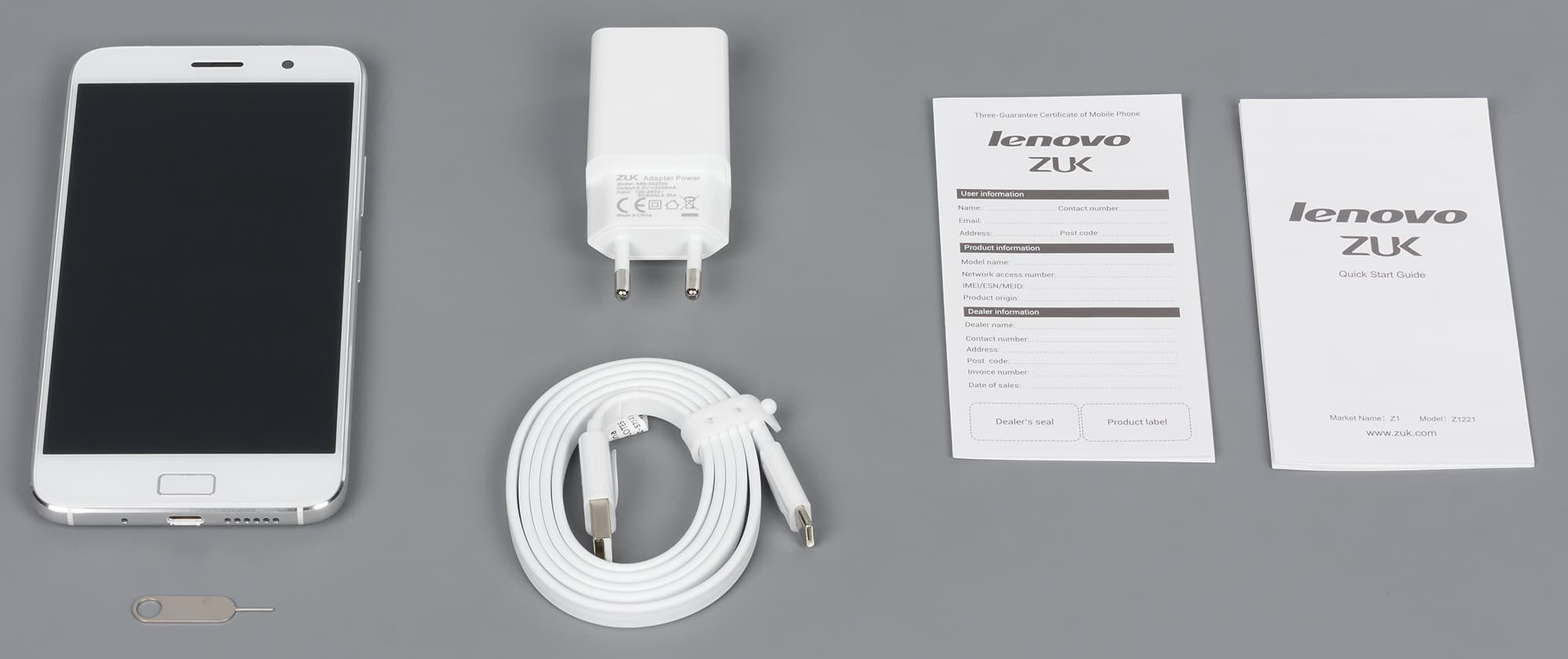 Комплектация минимальна: в коробке нашлись лишь зарядное устройство с выходным током 2 А и симпатичный прорезиненный кабель плоского сечения USB 3.0 Type C. Ключик для извлечения SIM-карт прикреплен к картонной коробочке с бумажной документацией.