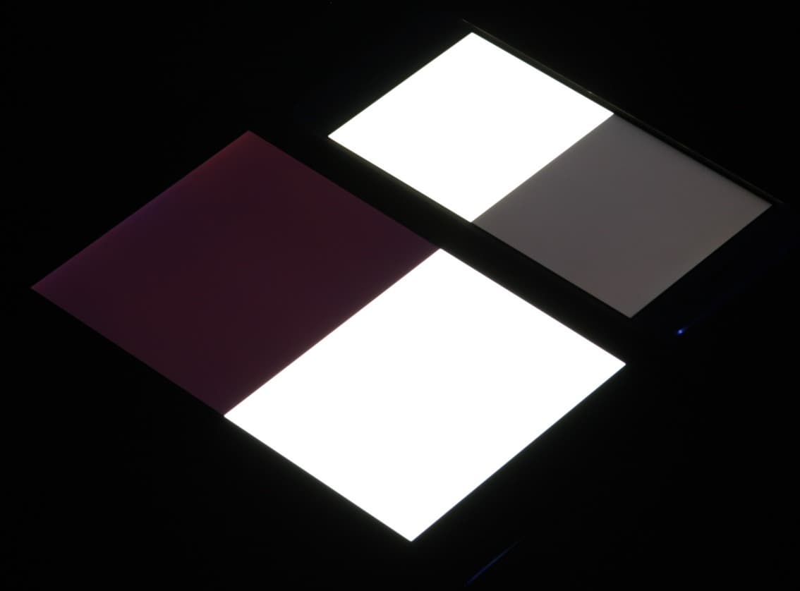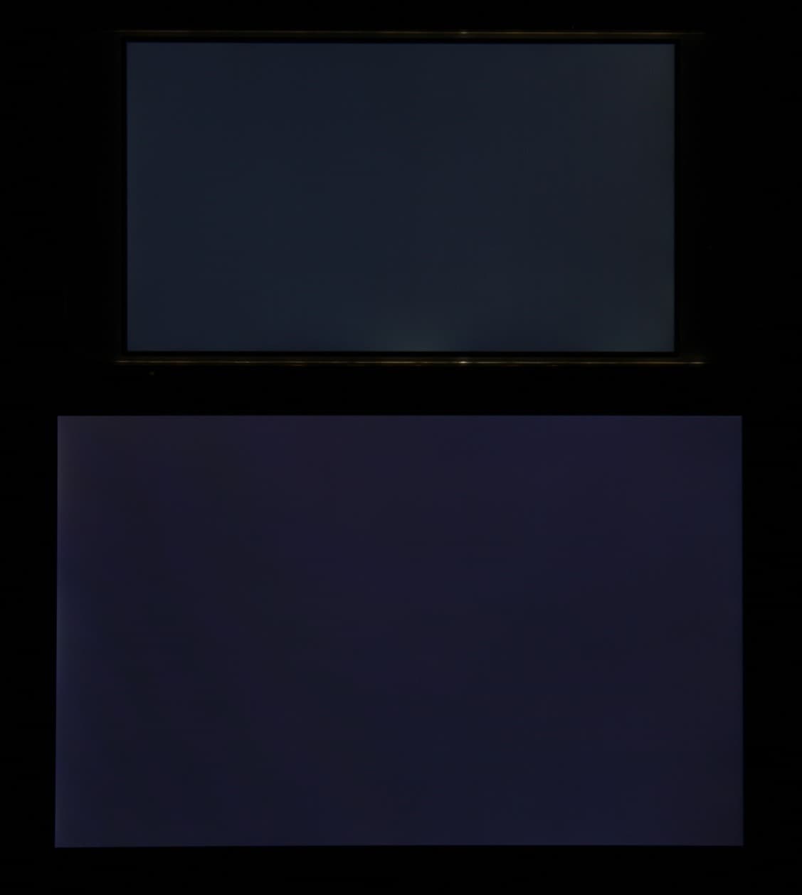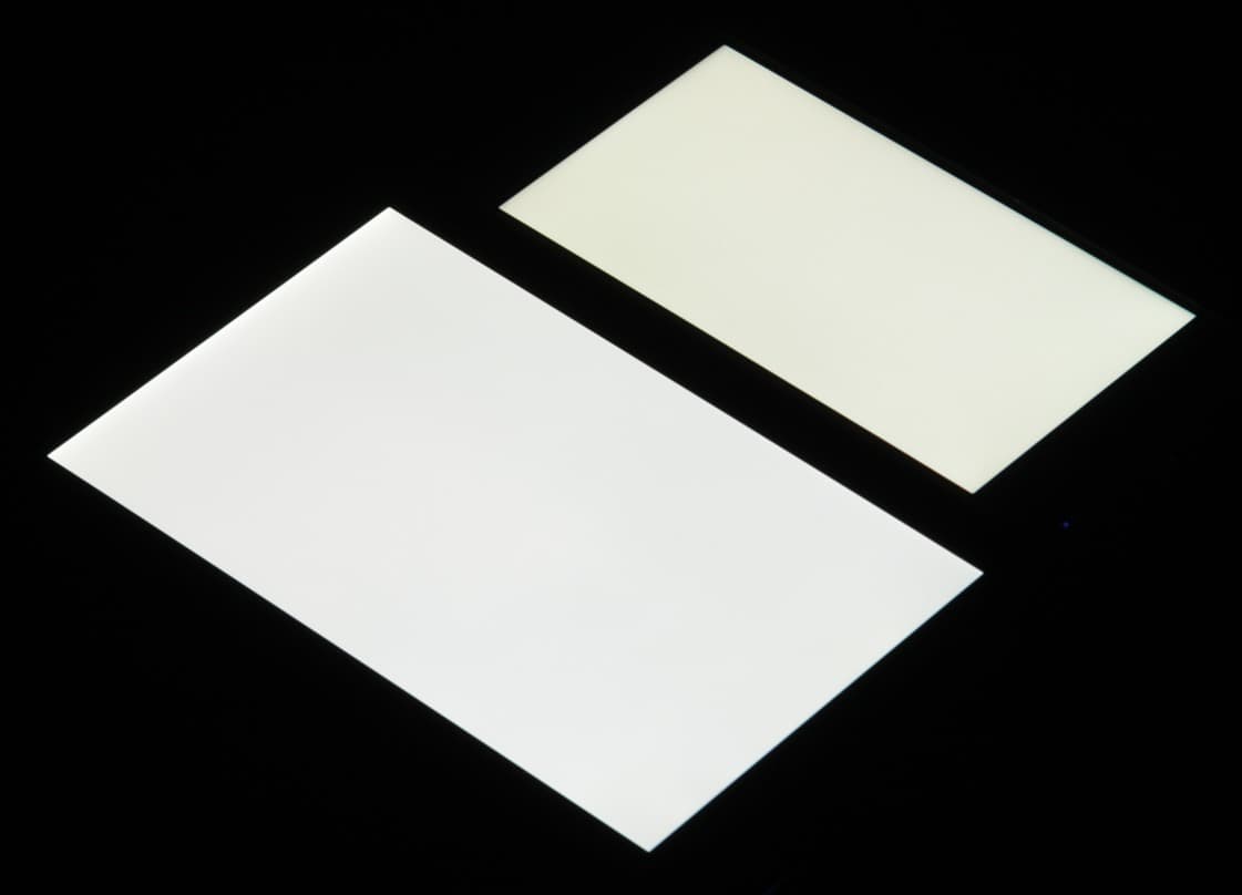 При перпендикулярном взгляде равномерность черного поля неидеальная, кроме того, белый корпус пропускает свет от светодиодов подсветки: