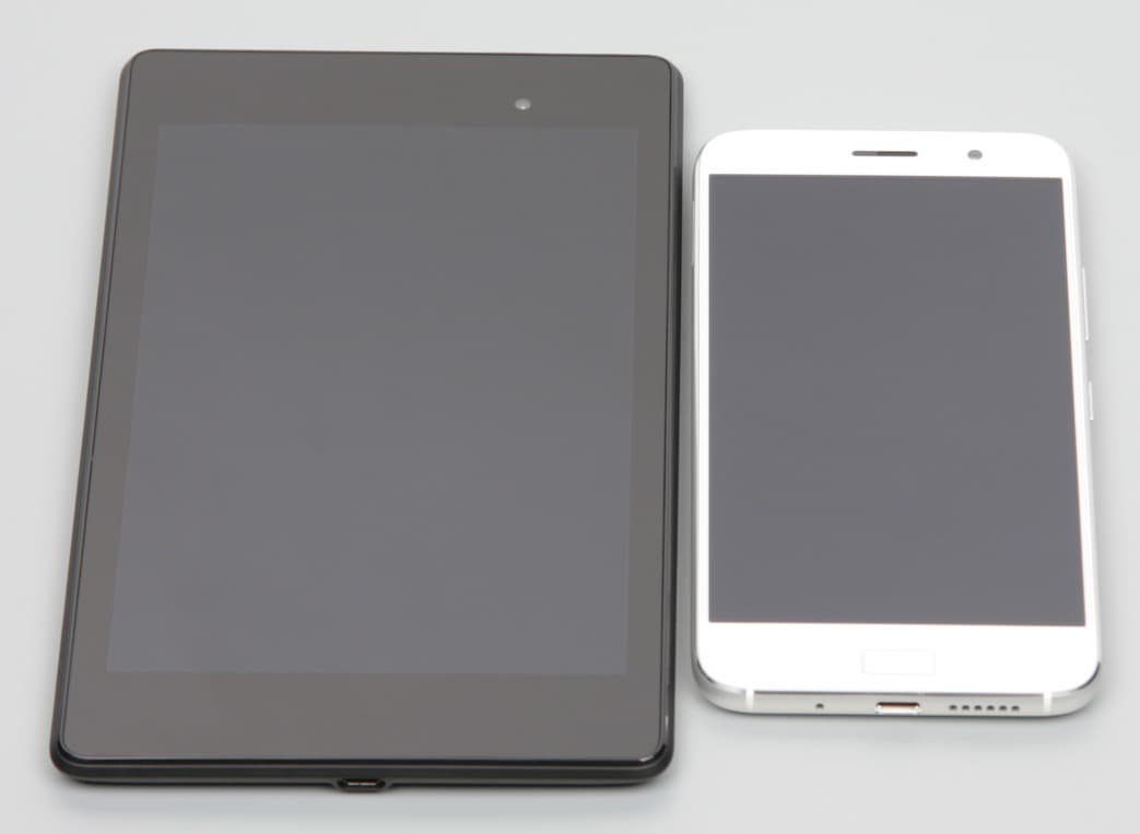 Лицевая поверхность экрана выполнена в виде стеклянной пластины с зеркально-гладкой поверхностью, устойчивой к появлению царапин. Судя по отражению объектов антибликовые свойства экрана не хуже, чем у экрана Google Nexus 7 (2013) (далее просто Nexus 7). Для наглядности приведем фотографию, на которой в выключенных экранах отражается белая поверхность (слева — Nexus 7, справа — Zuk Z1, далее их можно различать по размеру):