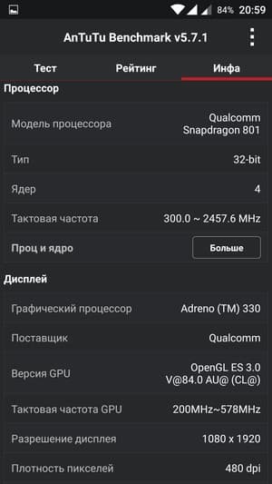 - SoC Qualcomm Snapdragon 801 (MSM8974AС), 2,5 ГГц, 4 ядра Krait 400