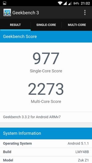 По результатам тестирований Zuk Z1 продемонстрировал весьма достойный уровень производительности. Флагманская платформа из прошлого еще вполне способна конкурировать даже с гораздо более современными флагманскими альтернативными решениями, такими как HiSilicon Kirin 935 и MediaTek MT6795. Snapdragon 801 уверенно демонстрирует результаты не менее высокие, чем у перечисленных SoC, как в комплексных, так и в специализированных графических тестах. При этом платформа явно уступает своей более продвинутой и более современной флагманской преемнице Qualcomm Snapdragon 810, и еще более далека от лидирующей на текущий момент Exynos 7420, используемой в максимально мощных современных аппаратах Samsung Galaxy S6/S6 edge/S6 edge+.