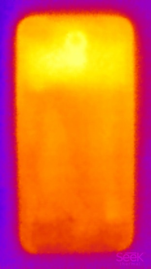Видно, что нагрев заметно больше локализован в верхней части аппарата, что, видимо, соответствует расположению микросхемы SoC. По данным теплокамеры, максимальный нагрев составил 38 градусов (при температуре окружающего воздуха в 24 градуса), это не очень много.