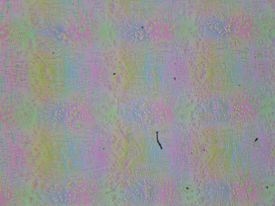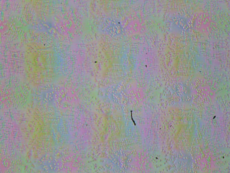 Зерно этих дефектов в несколько раз меньше размеров субпикселей (масштаб этих двух фотографий примерно одинаковый), поэтому фокусировка на микродефектах и «перескок» фокуса по субпикселям при изменении угла зрения выражены слабо, из-за этого нет и «кристаллического» эффекта.