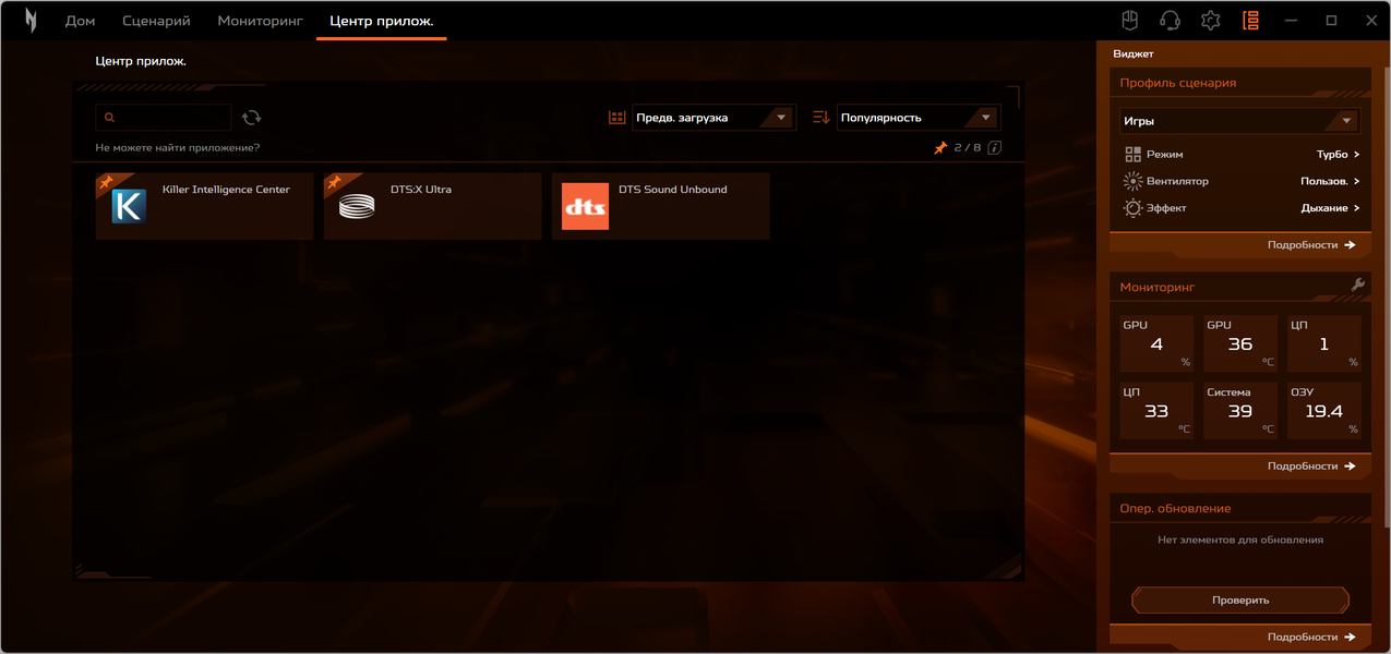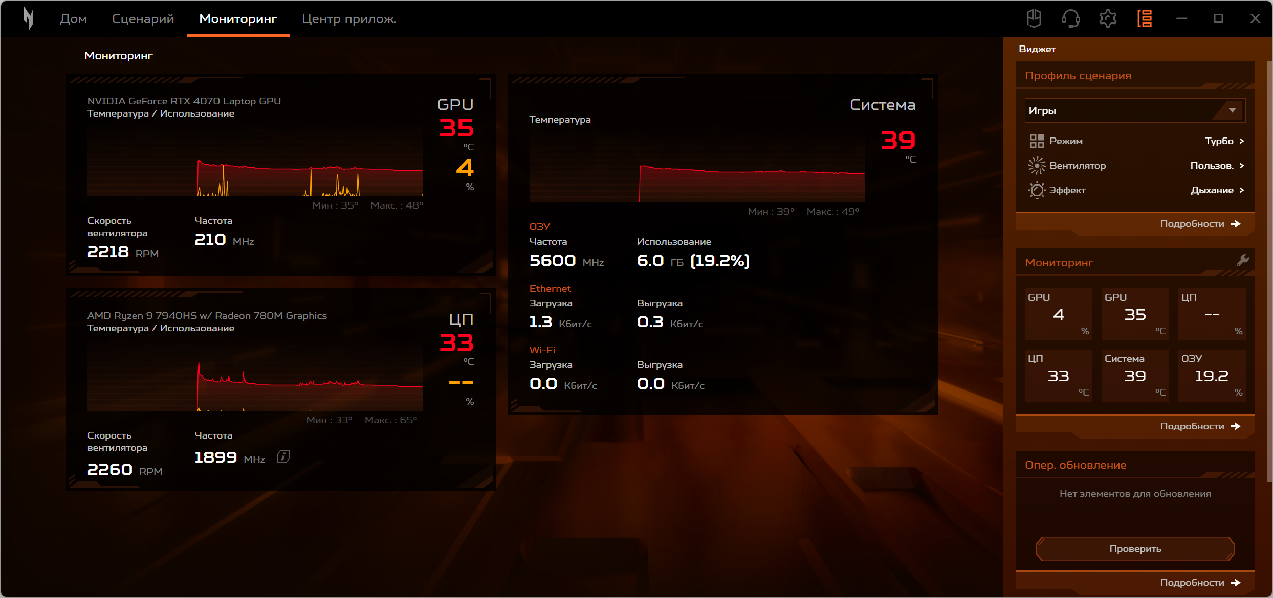 В разделе «Мониторинг» в окно приложения выводятся тактовая частота, температура, степень загрузки вычислителей, скорость вращения вентиляторов системы охлаждения, использование ОЗУ и загрузка кабельного и беспроводного сетевых подключений.