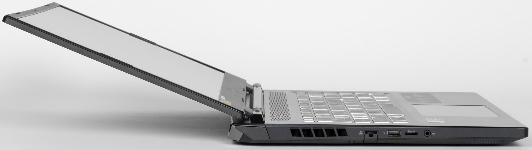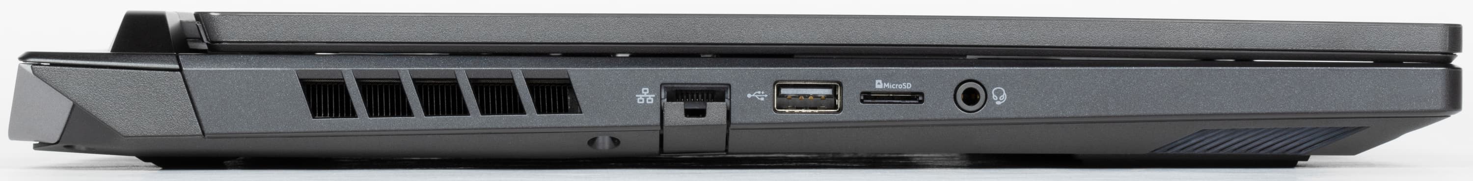На левой боковой панели имеются решетка выходного отверстия системы охлаждения, розетка RJ-45, порт USB 2.0 Type-A, слот картовода для microSD и комбинированный аудиоразъем для гарнитуры (миниджек 3,5 мм).