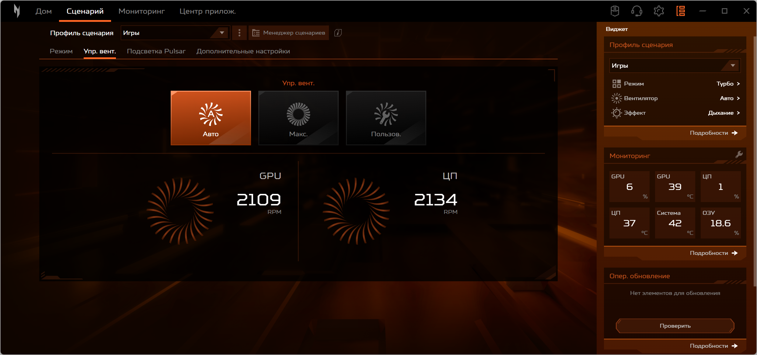 Подраздел «Управление вентиляторами» дает возможность установки их реакции на рост потребления (и температуры) вычислителей. Опция «Авто» подразумевает автоматический режим, «Макс.» — максимальные обороты, «Пользов.» позволяет определить вручную изменять характер реакции кулеров.