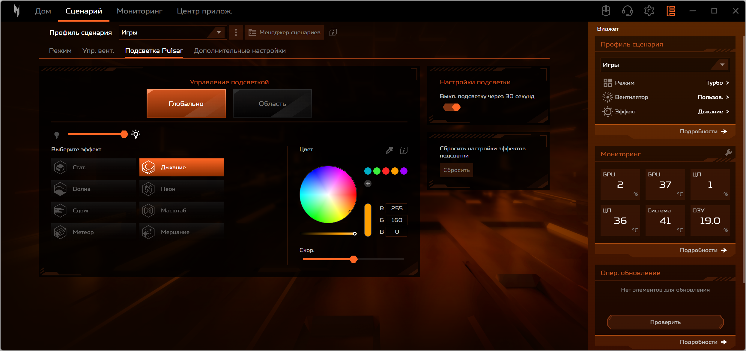 Подраздел «Подсветка Pulsar» содержит настройки режима подсветки клавиатуры.