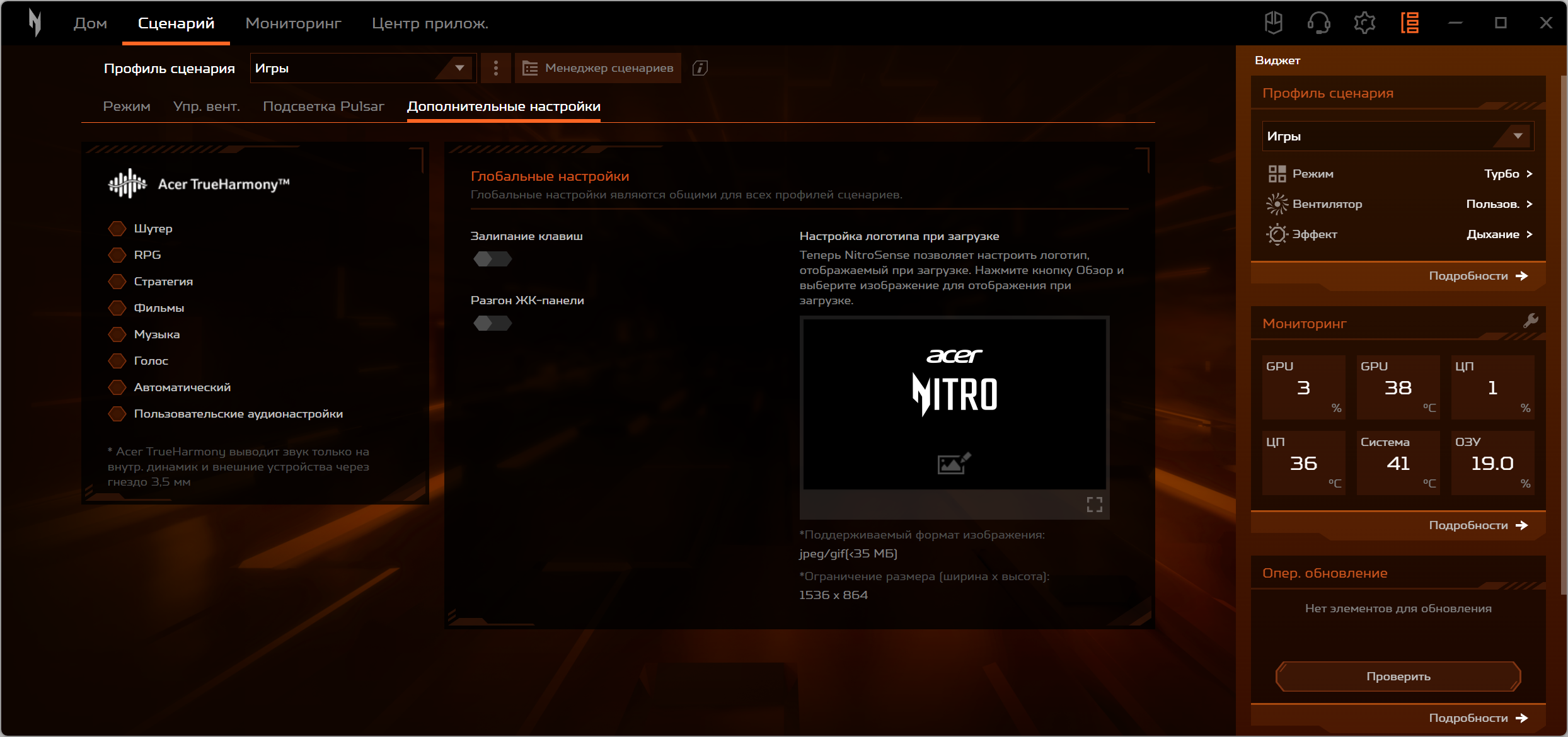 Подраздел «Дополнительные настройки» позволяет настраивать акустику системы посредством Acer TrueHarmony, а также установить некоторые глобальные параметры.
