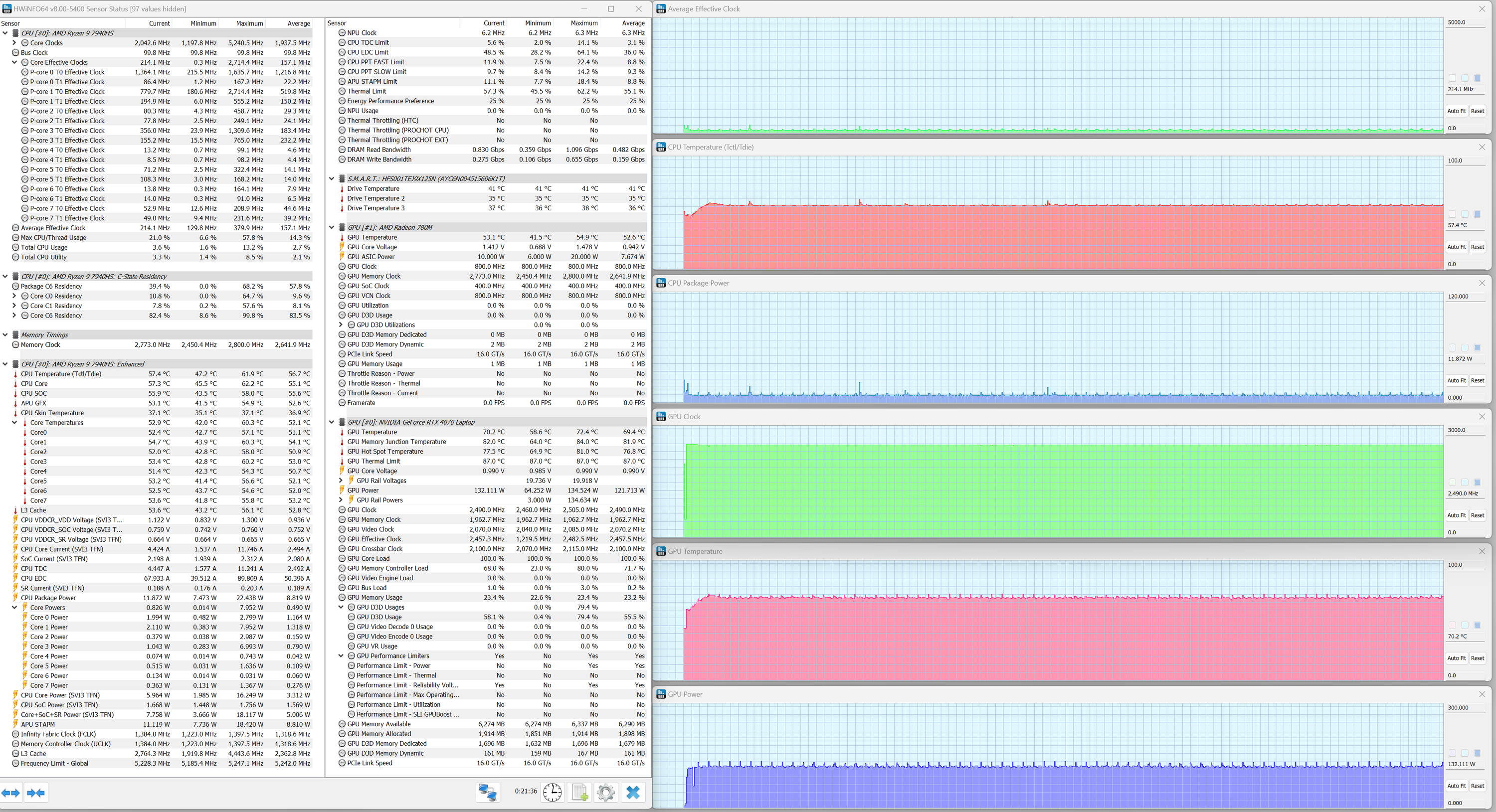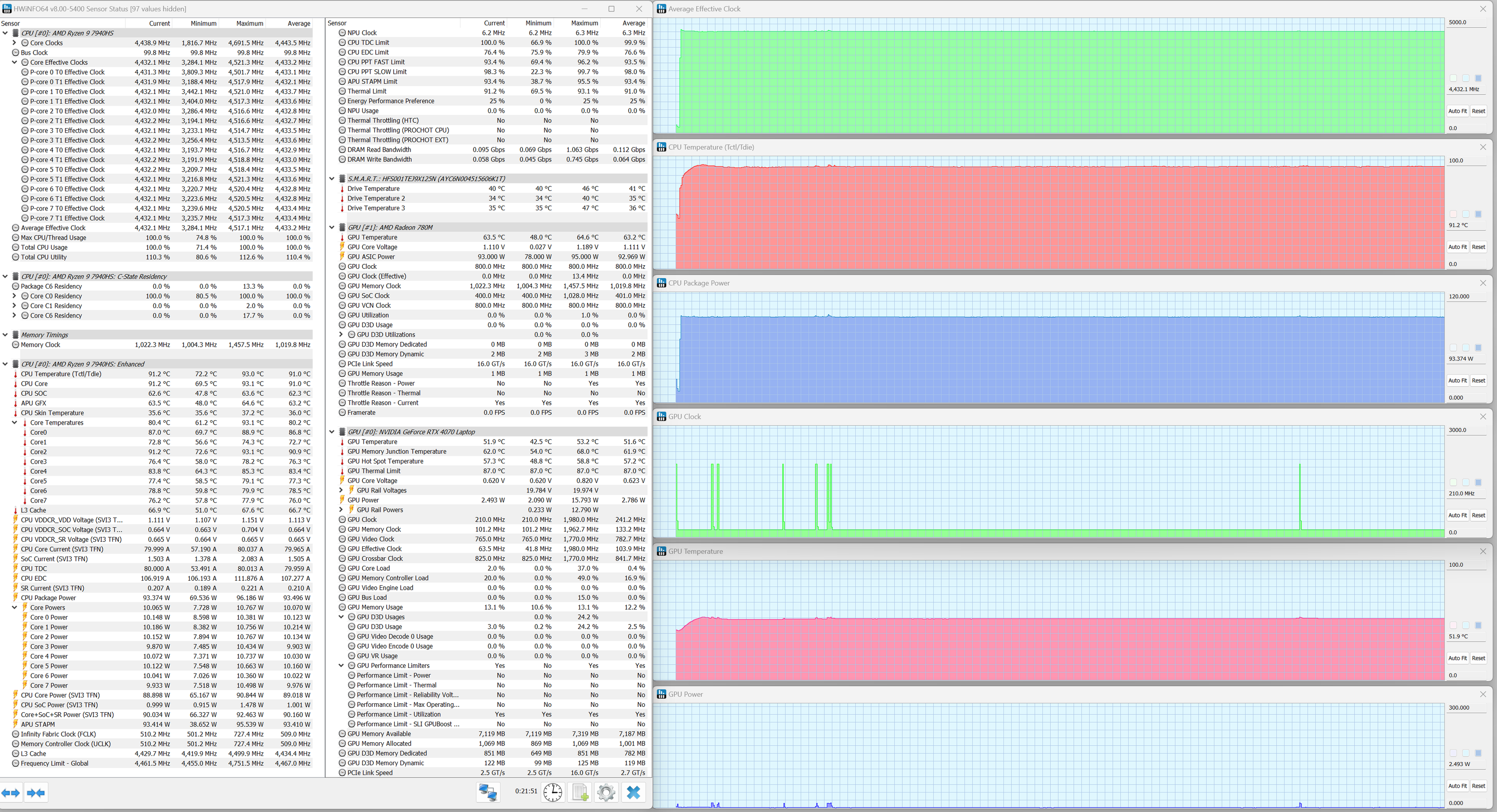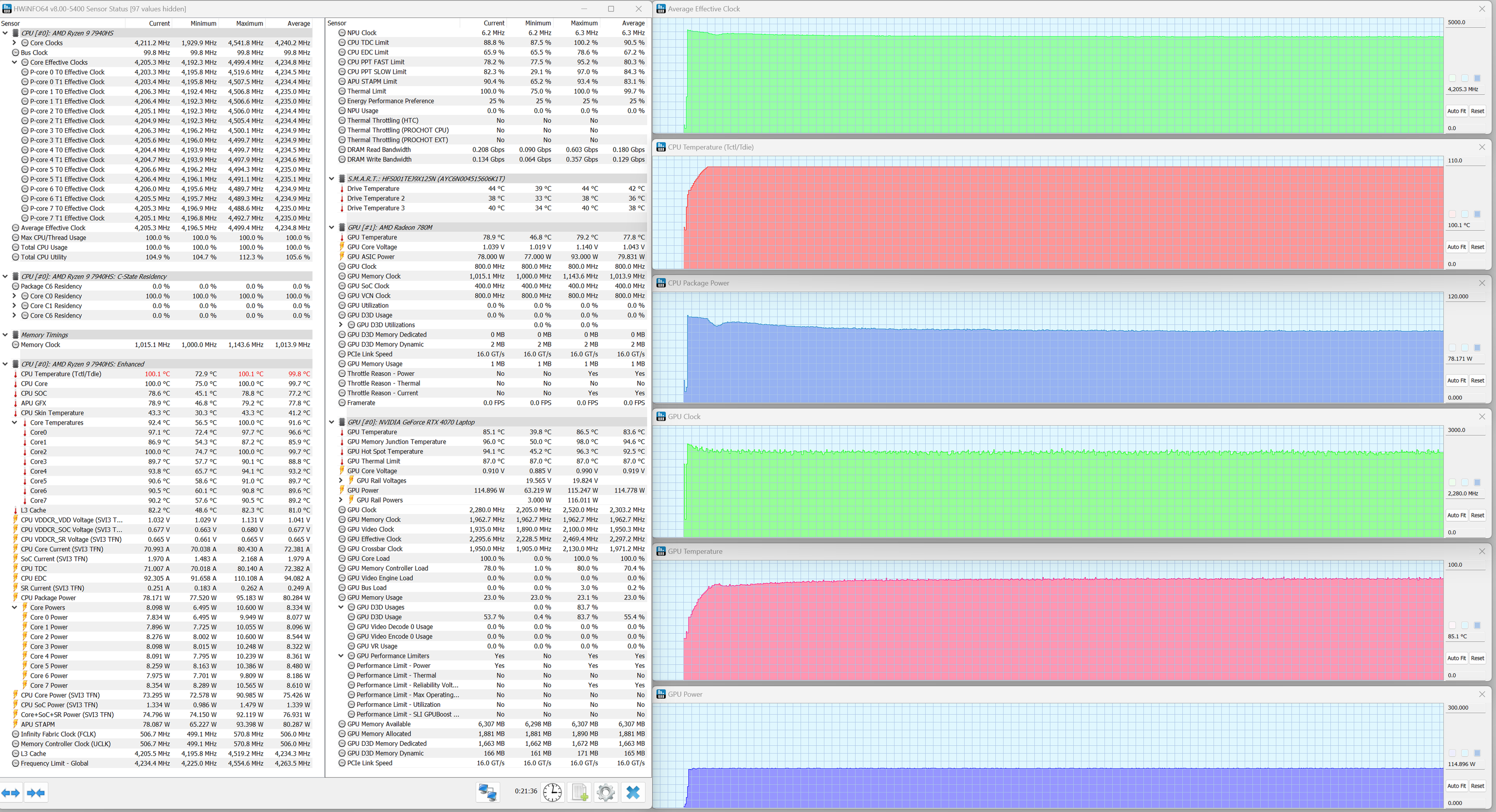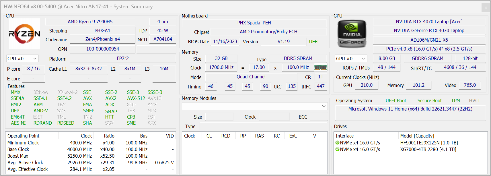 Ноутбук Acer Nitro 17 AN17-41-R3S4 оснащен центральным процессором AMD Ryzen 9 7940HS с микроархитектурой Phoenix-HS (Zen 4), увидевшим свет в январе 2023 г. Процессор содержит в своем составе восемь ядер (16 потоков). Тактовая частота составляет 4 ГГц в стабильном режиме и до 5,2 ГГц при разгоне. TDP определен производителем в диапазоне 35—54 Вт, максимальная рабочая температура — 100 °C. Низкоуровневые параметры CPU представлены ниже на скриншоте утилиты HWInfo.