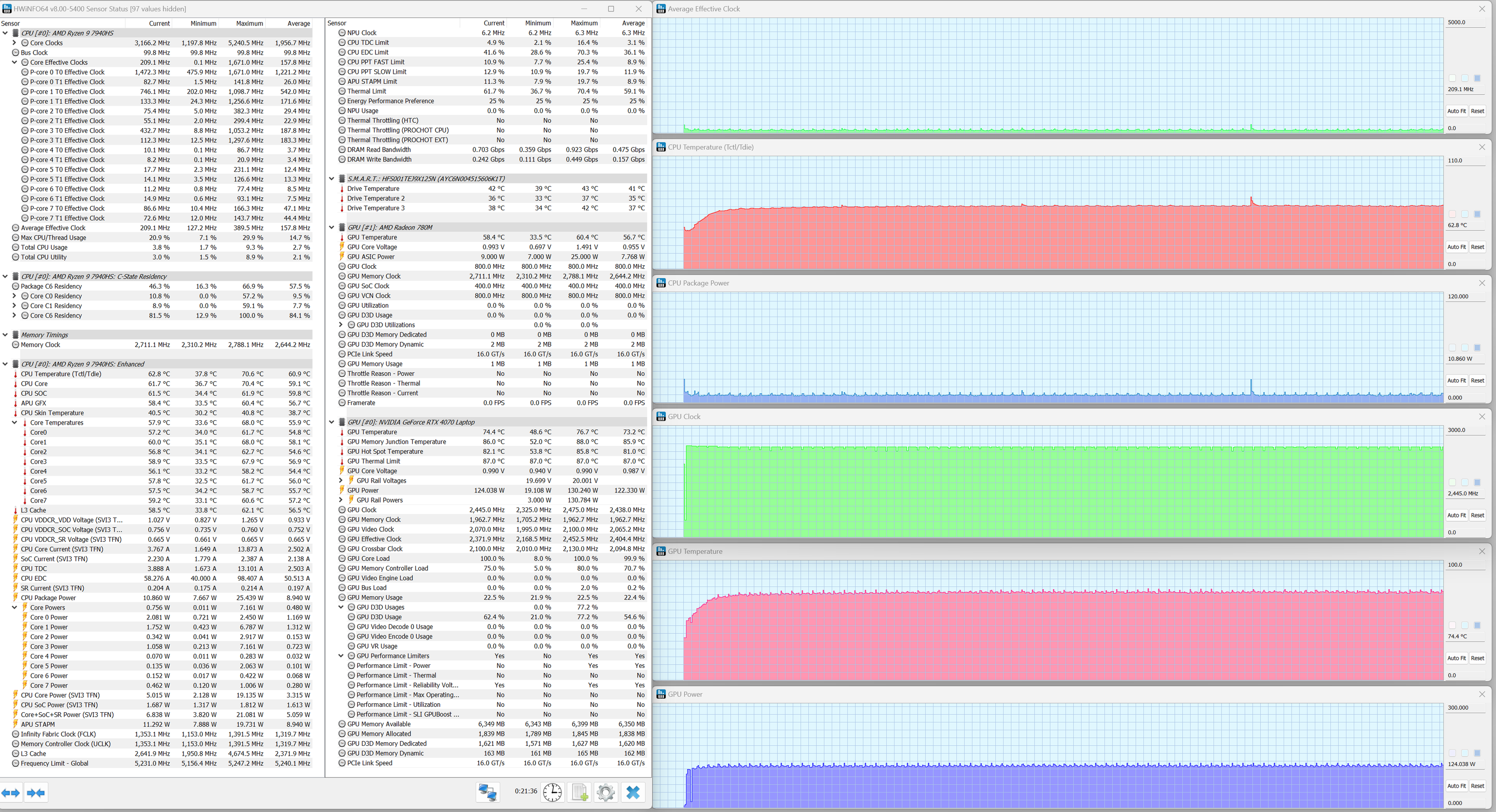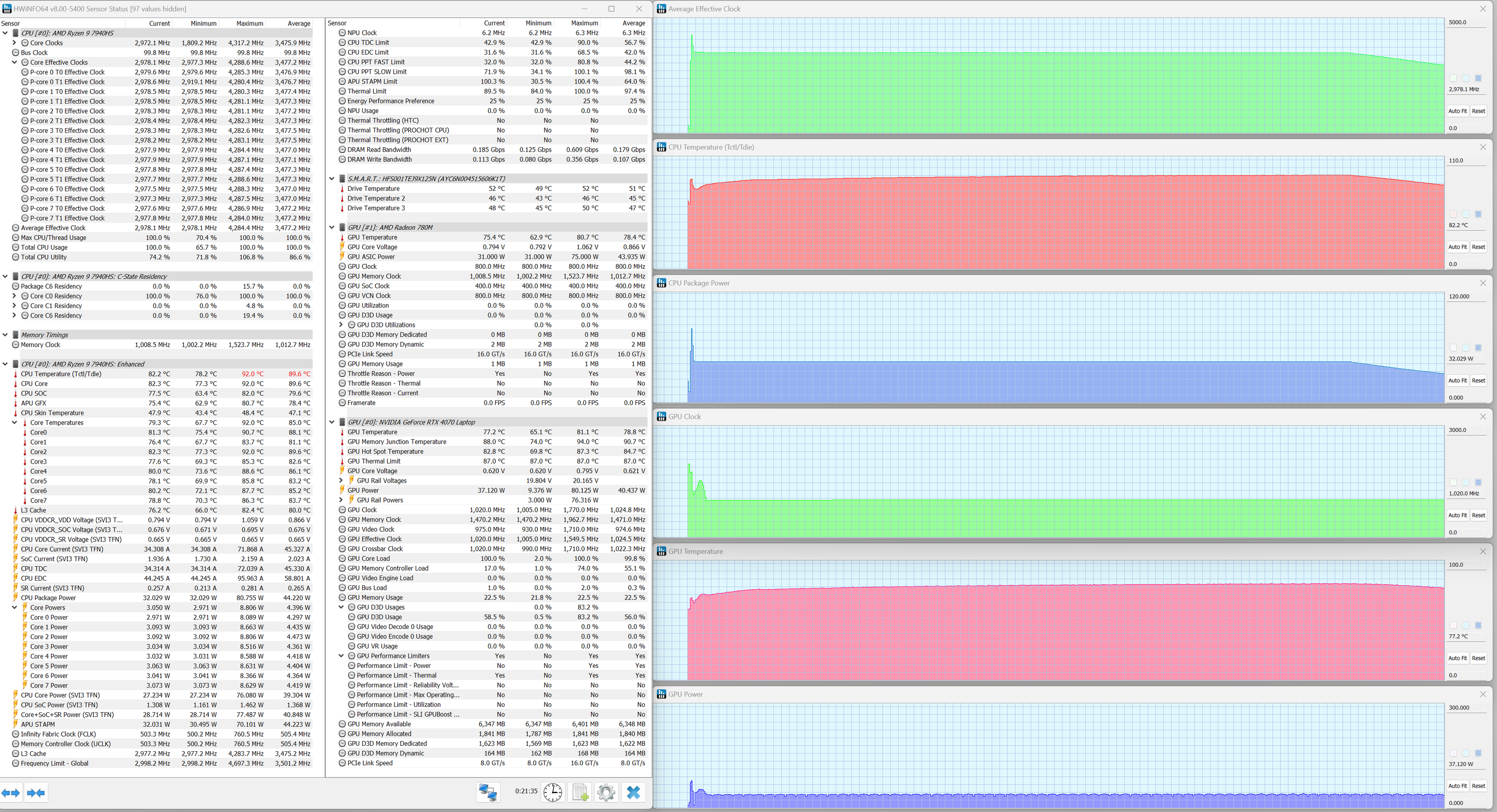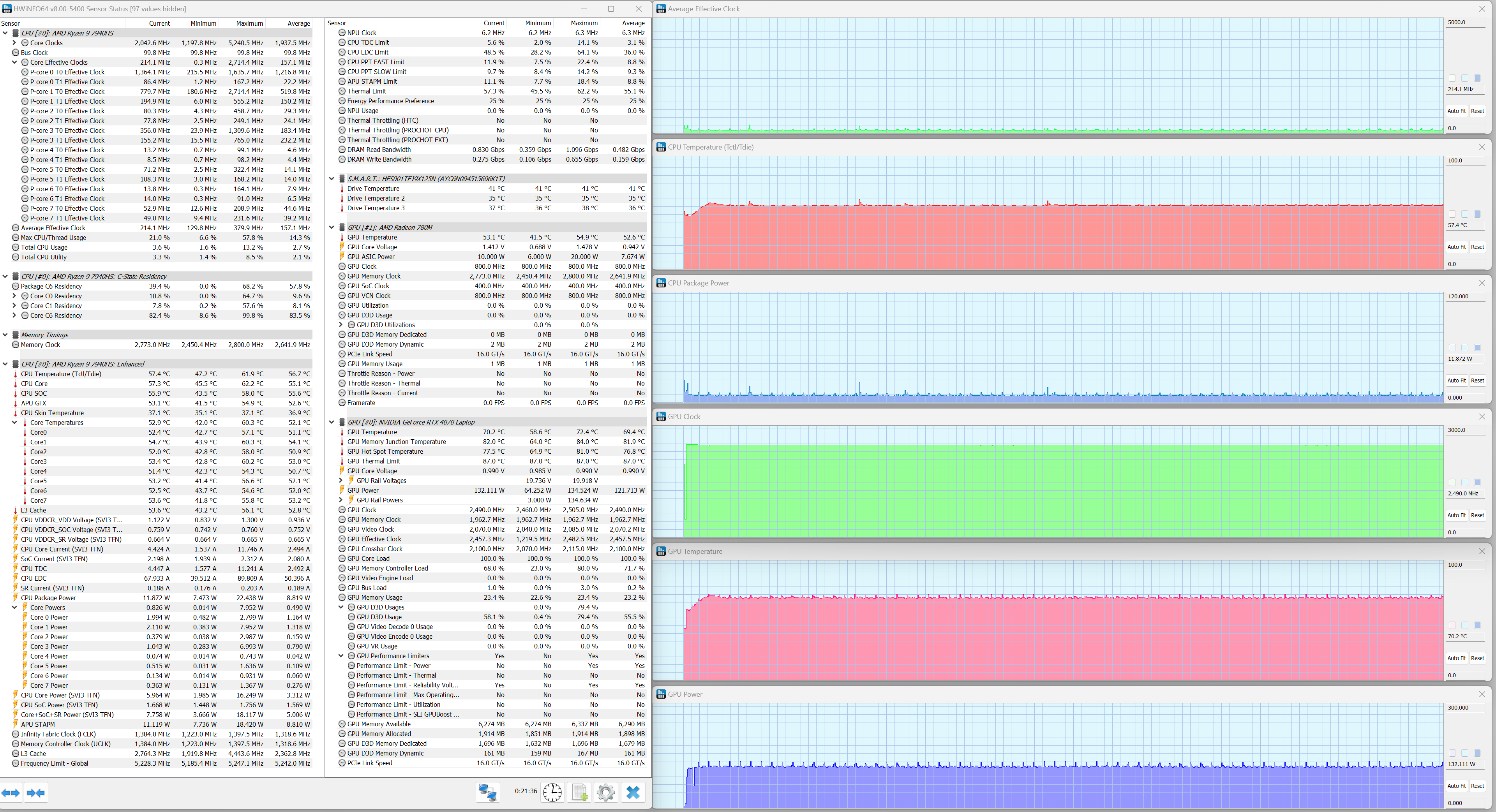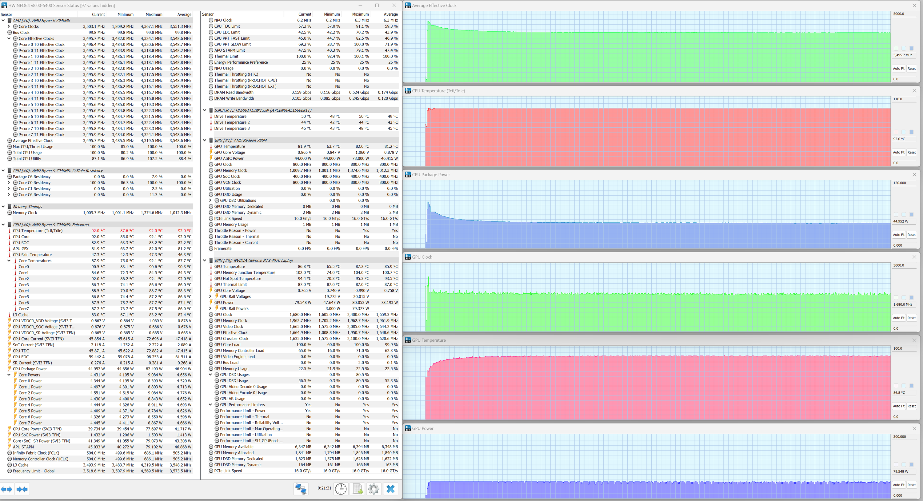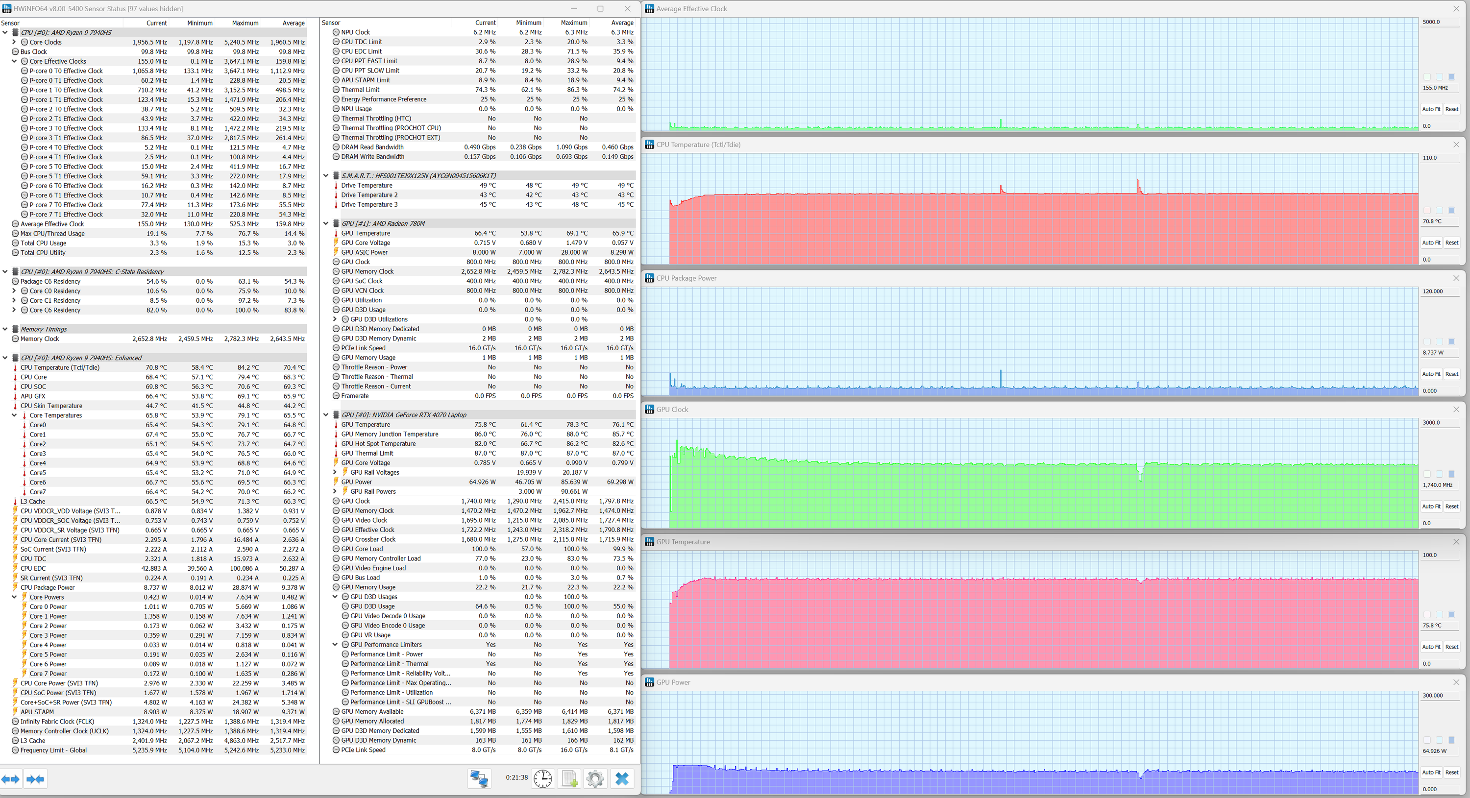 Ноутбук Acer Nitro 17 AN17-41-R3S4 оснащен центральным процессором AMD Ryzen 9 7940HS с микроархитектурой Phoenix-HS (Zen 4), увидевшим свет в январе 2023 г. Процессор содержит в своем составе восемь ядер (16 потоков). Тактовая частота составляет 4 ГГц в стабильном режиме и до 5,2 ГГц при разгоне. TDP определен производителем в диапазоне 35—54 Вт, максимальная рабочая температура — 100 °C. Низкоуровневые параметры CPU представлены ниже на скриншоте утилиты HWInfo.