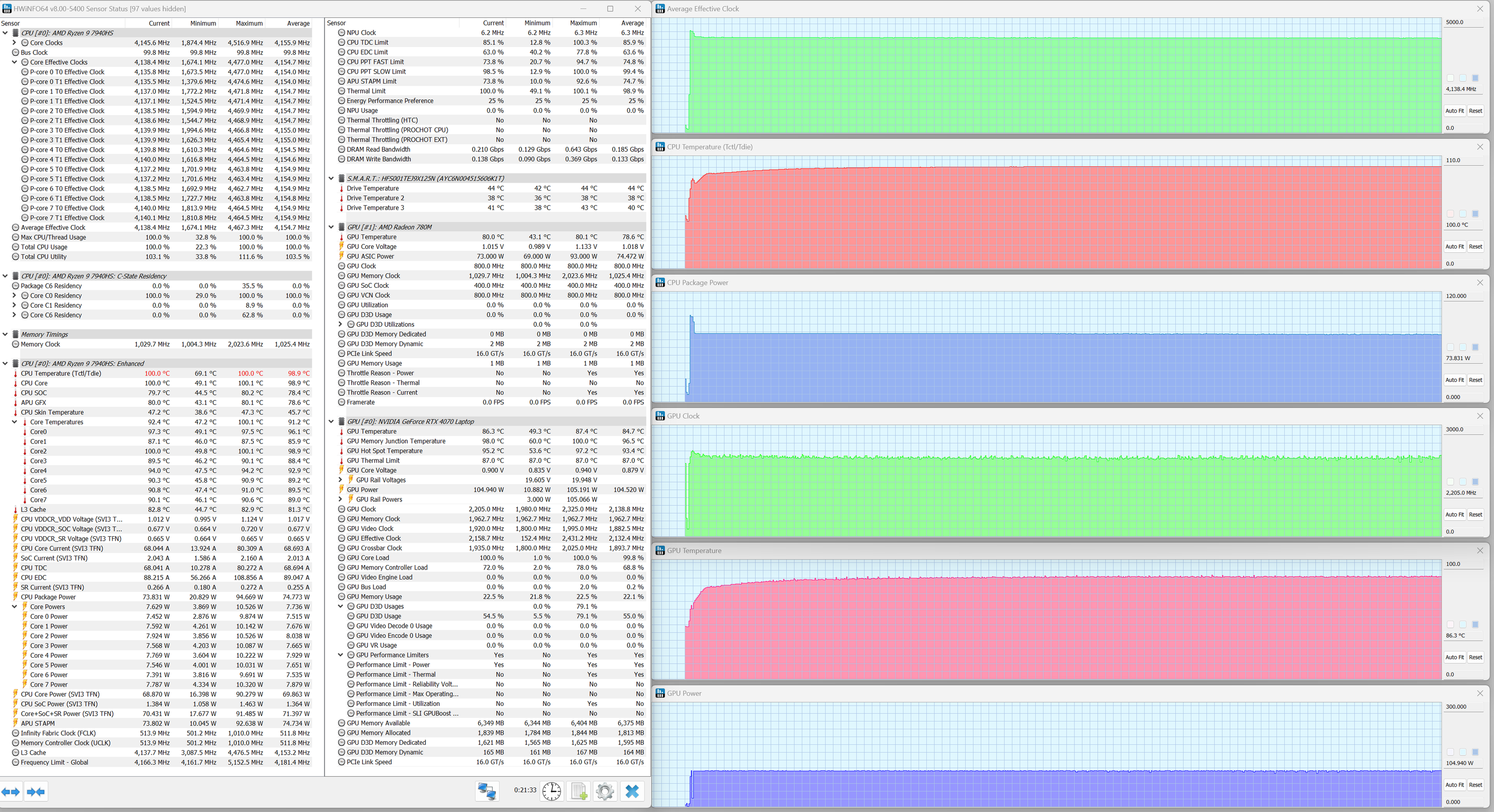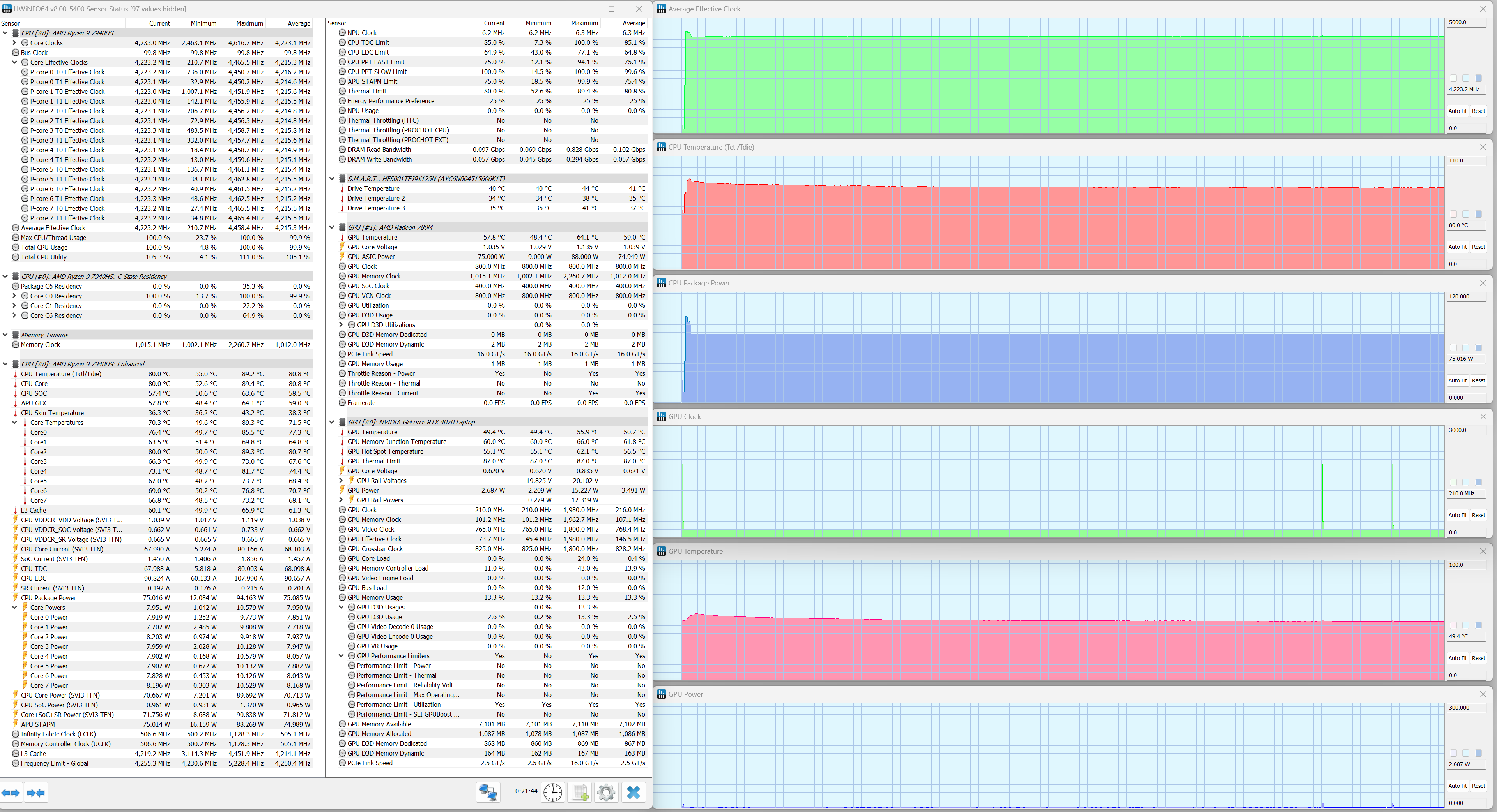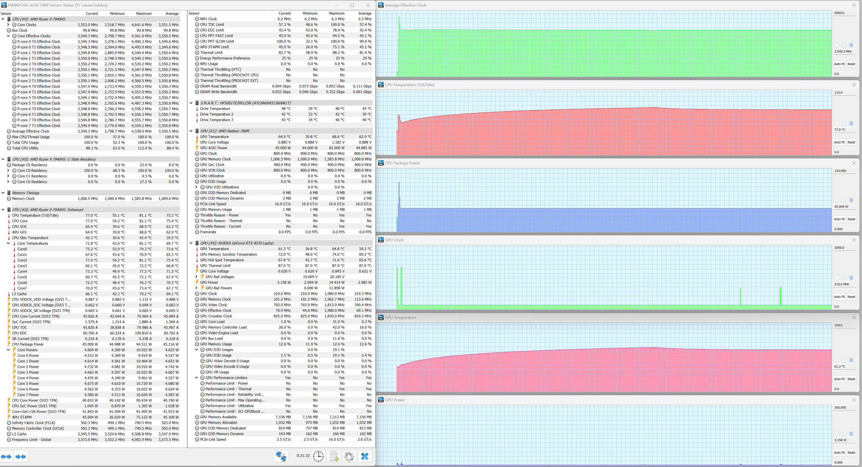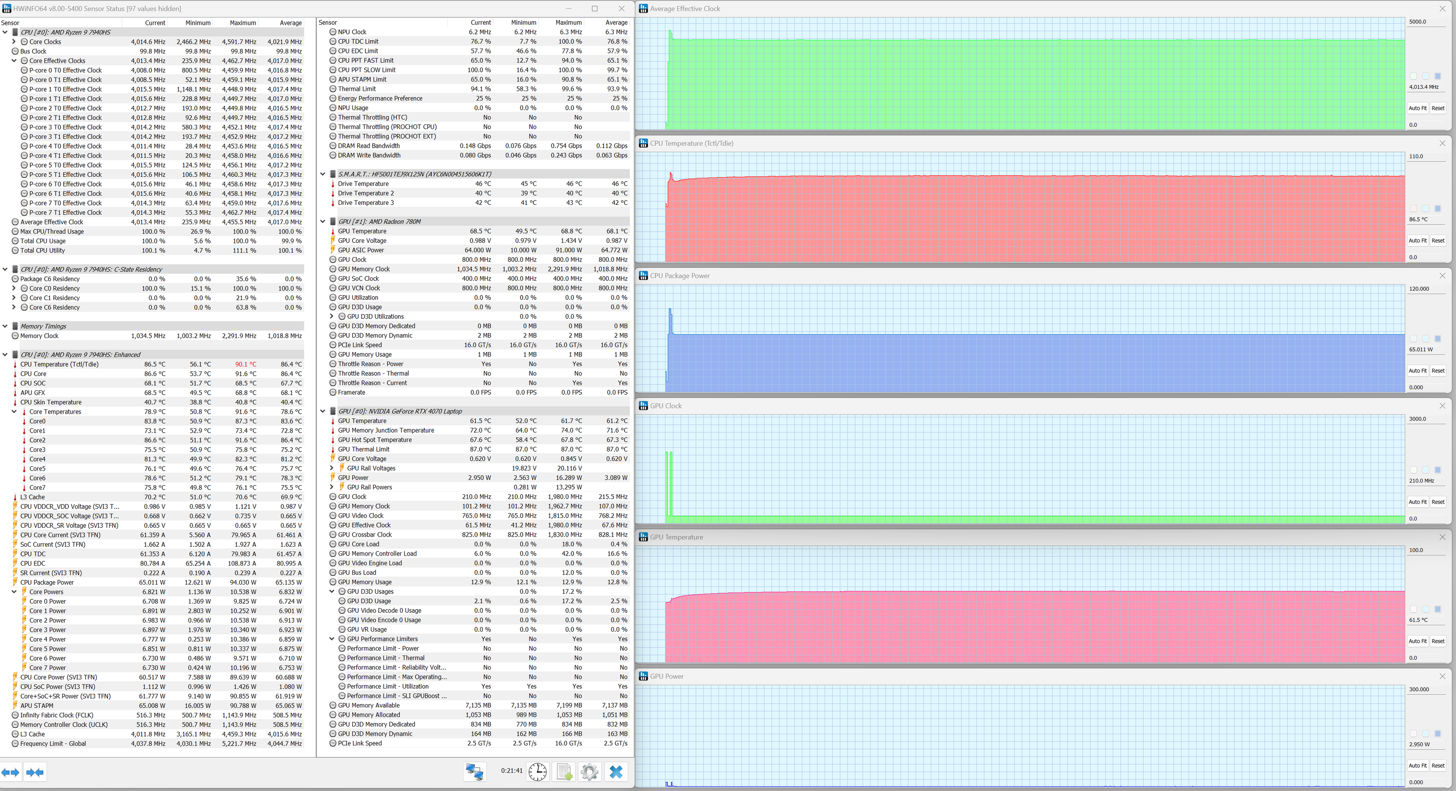 Ноутбук Acer Nitro 17 AN17-41-R3S4 оснащен центральным процессором AMD Ryzen 9 7940HS с микроархитектурой Phoenix-HS (Zen 4), увидевшим свет в январе 2023 г. Процессор содержит в своем составе восемь ядер (16 потоков). Тактовая частота составляет 4 ГГц в стабильном режиме и до 5,2 ГГц при разгоне. TDP определен производителем в диапазоне 35—54 Вт, максимальная рабочая температура — 100 °C. Низкоуровневые параметры CPU представлены ниже на скриншоте утилиты HWInfo.