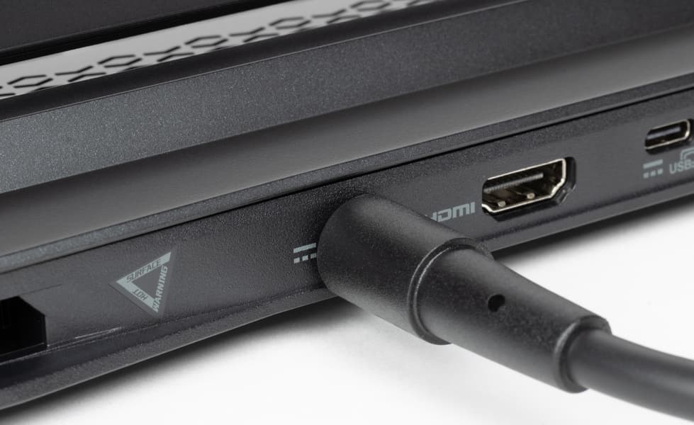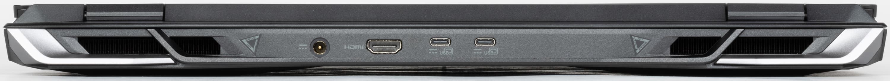 Справа и слева на задней панели видны выходные отверстия радиаторов, через которые из внутреннего пространства ноутбука наружу выбрасывается горячий воздух. Между ними помещаются коаксиальный разъем для подключения адаптера питания, видеовыход HDMI и два порта USB Type-С.