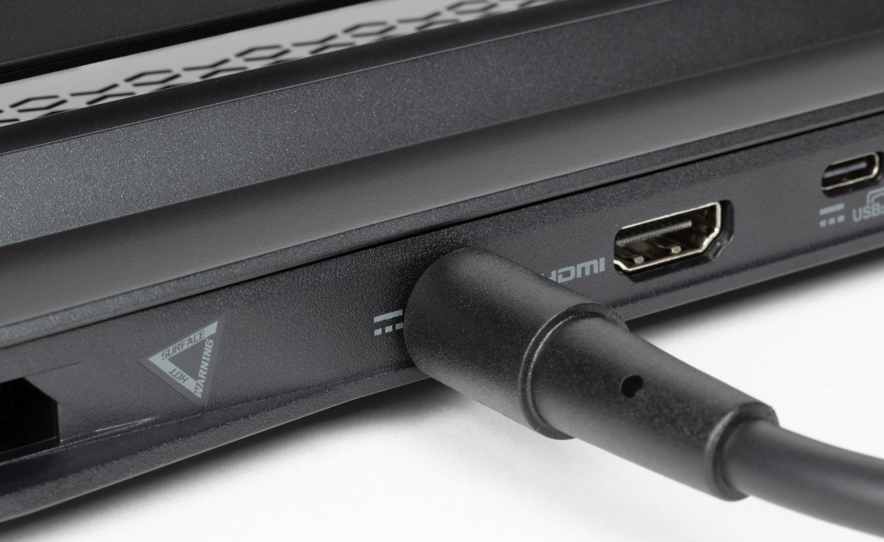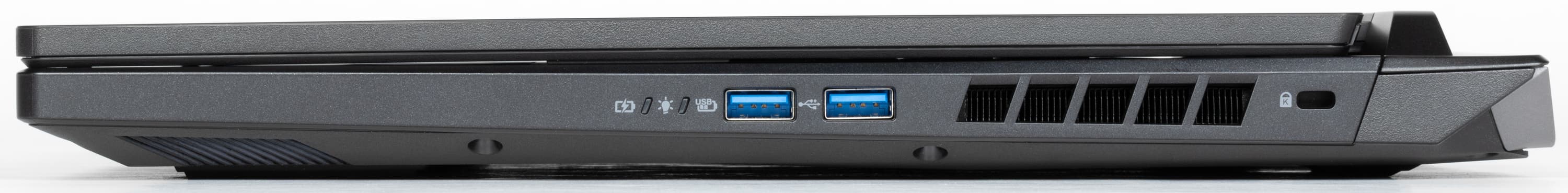 Справа расположены светодиодные индикаторы зарядки батареи и подключения к электрической сети, два порта USB 3.2 Gen2 Type-А, боковая решетка выходного тракта системы охлаждения и крепление кенсингтонского замка.