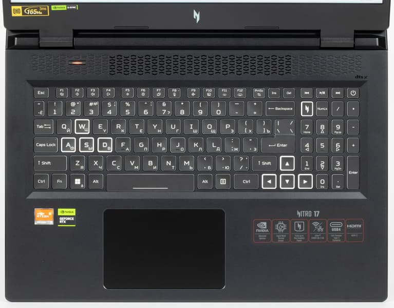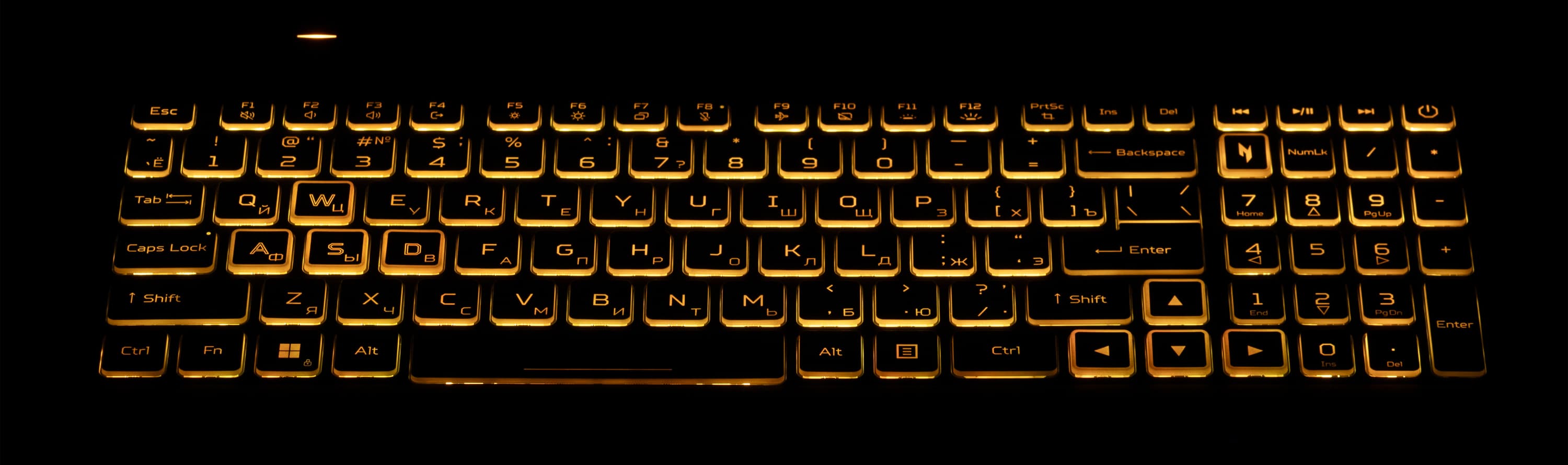 Алфавитно-цифровые и символьные клавиши традиционных размеров 16×16 мм. Расстояние между центрами составляет 19 мм, а между краями — 4 мм. Функциональные кнопки уменьшены (14×10 мм). Клавиша Space — 92 мм, левая Shift — 34 мм, правая Shift — 25 мм. Кнопки Fn, Windows и Alt по размерам не отличаются от обычных символьных. Правая Ctrl удлинена (26 мм). Caps Lock — 26 мм, Tab — 21 мм, Backspace 30 мм, Enter 36 мм. «Стрелки» полноразмерные. Цифровой блок представлен полным набором из 22 элементов, несколько уменьшенных по ширине (16×12 мм), а Del, Ins, PrintScreen такого же размера, как функциональные кнопки (14×10 мм). Pause/Break отсутствует. Широкими белыми рамками выделены игровые клавиши A, W, S, D, «стрелки» и специальная кнопка между Backspace и NumLock с логотипом серии Nitro, с помощью которой вызывается фирменная утилита NitroSense.