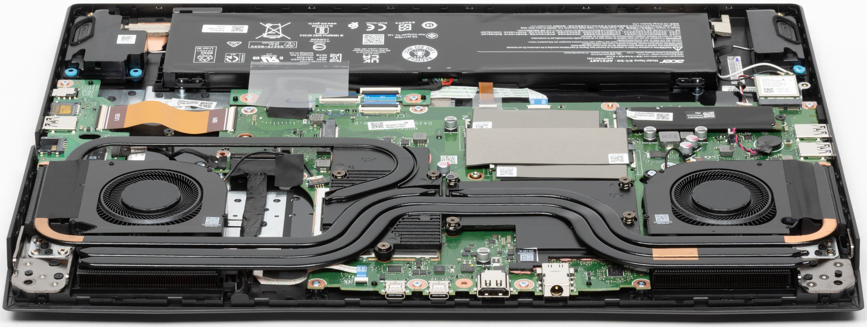 Система охлаждения имеет классическую схему, принятую в большинстве игровых портативных ПК: два кулера и четыре радиатора. Вентиляторы захватывают воздух из окружающей среды двумя потоками через отверстия в днище и изгоняют его через четыре теплообменника (двумя потоками назад, одним влево и одним вправо). Тепло от вычислителей отводится пятью тепловыми трубками, две из которых общие для CPU и GPU и образуют общий контур, поэтому вентиляторы процессора и видеокарты вращаются более-менее синхронно при нагрузке на каждый из вычислителей по отдельности.
