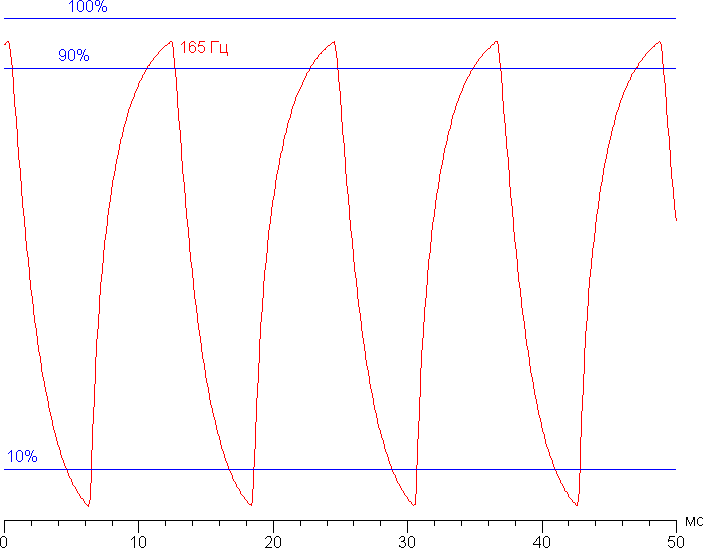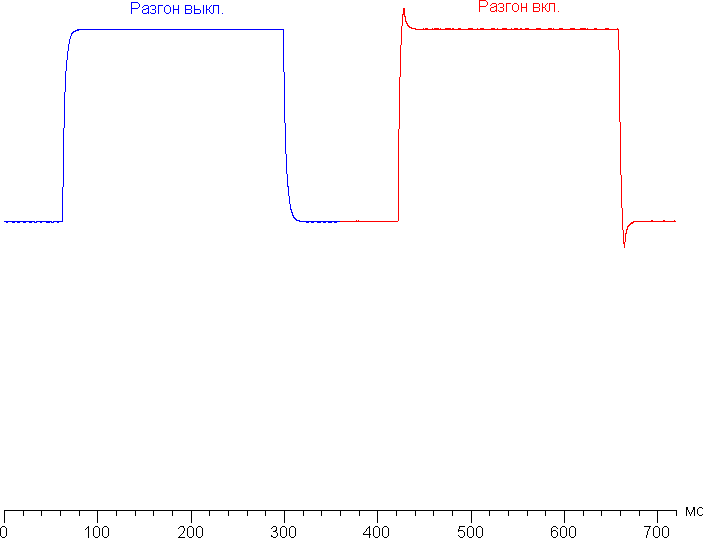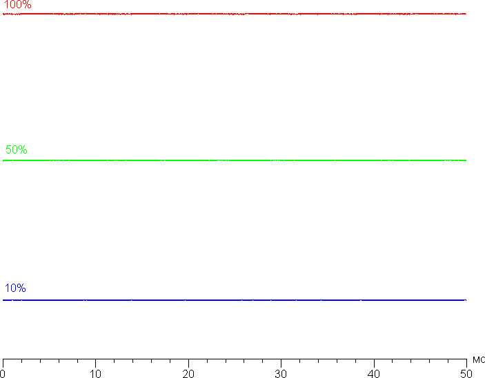 На любом уровне яркости значимая модуляция подсветки отсутствует, поэтому нет и никакого мерцания экрана (нет ШИМ). В доказательство приведем графики зависимости яркости (вертикальная ось) от времени (горизонтальная ось) при различных значениях настройки яркости: