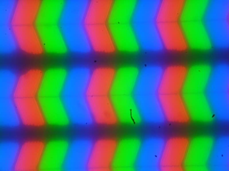 В этом ноутбуке используется матрица типа IPS. Микрофотографии демонстрируют типичную для IPS структуру субпикселей (черные точки — это пыль на матрице фотоаппарата):