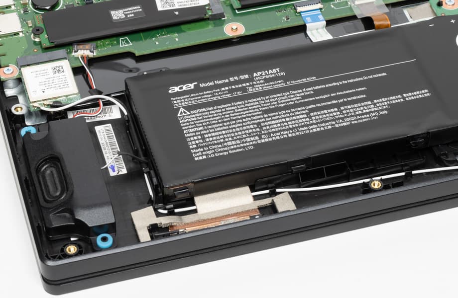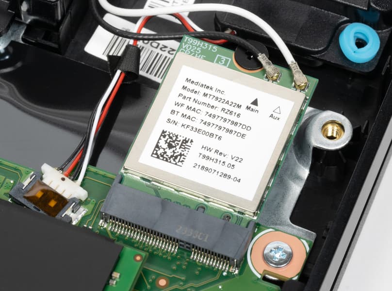 Над правым динамиком помещается адаптер беспроводной связи Mediatek MT7922A22M класса Wi-Fi 6E с поддержкой стандарта IEEE 802.11ax. Он же реализует связь по Bluetooth.