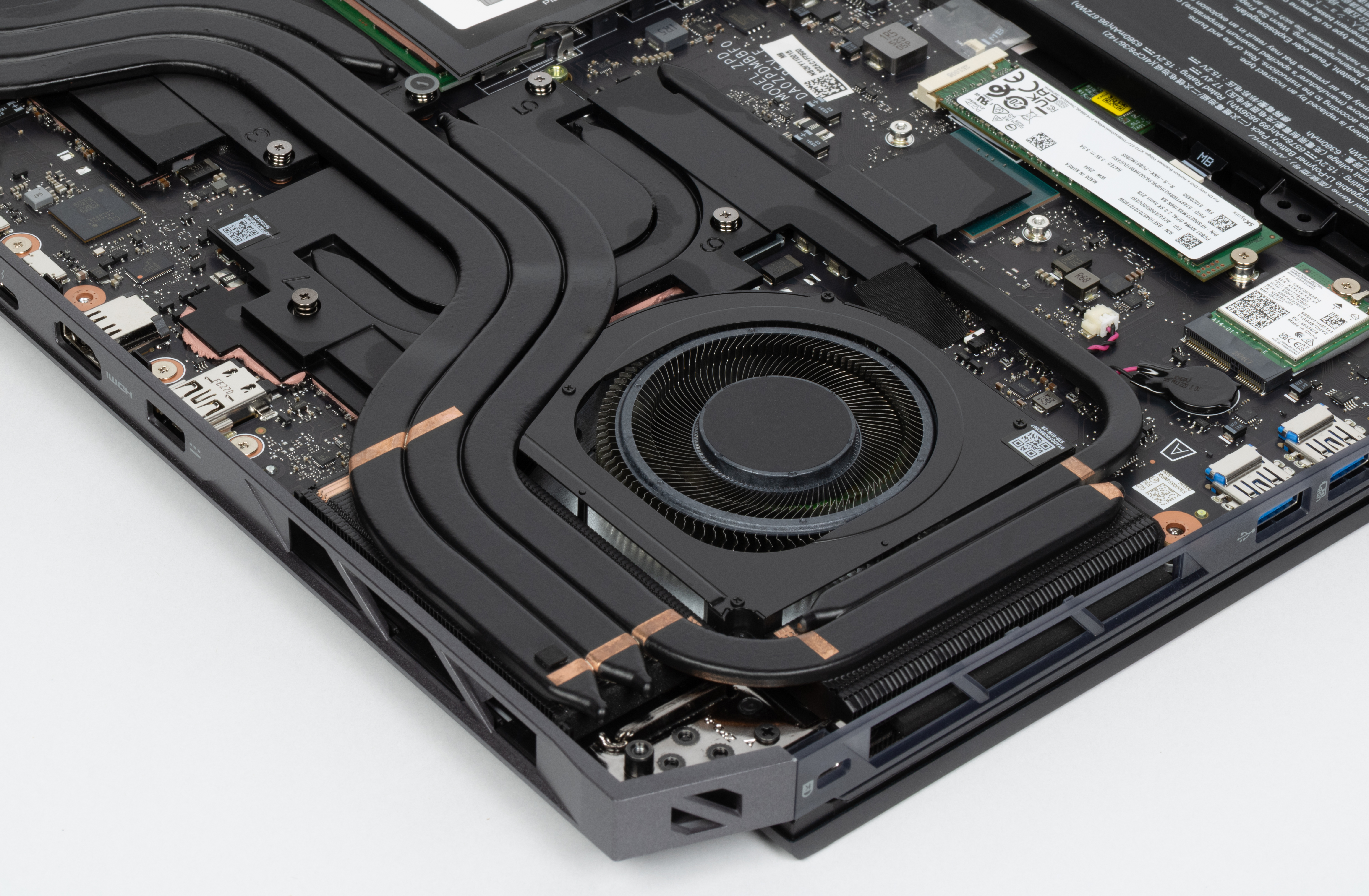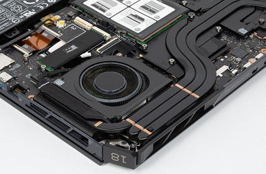 Причем и для первого, и для опционального третьего SSD на той же крышке имеются места для крепления подобных радиаторов; что помешало поставить второй радиатор — загадка, сто́ит-то он копейки. Конечно, второй накопитель более быстрый и более «горячий» (у него потребление до 3,5 А@3,3 В против 2,5 А@3,3 В у первого), а потому требует лучшего охлаждения, но тогда еще одна загадка: почему он не сделан системным?