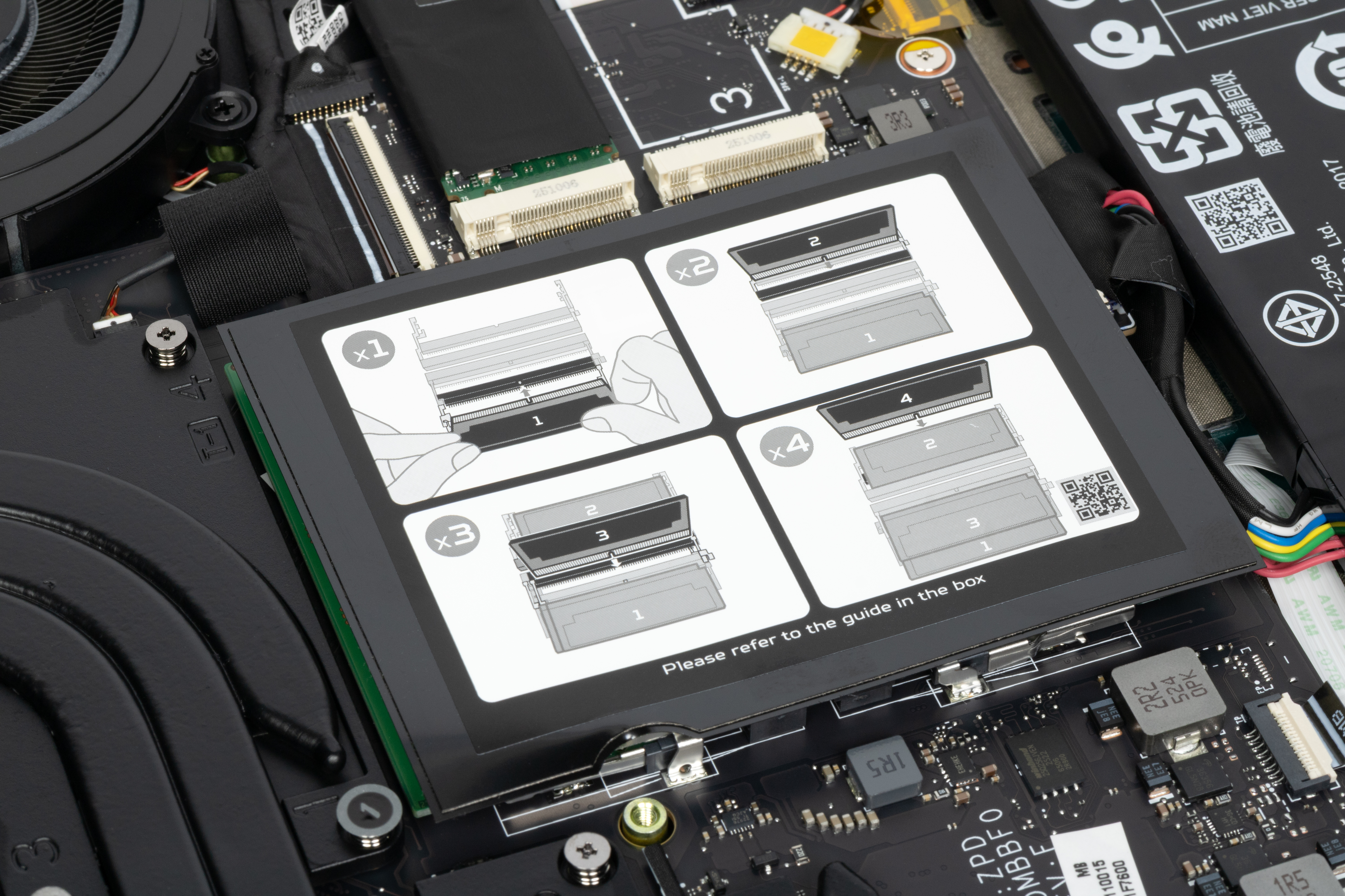 На плате четыре слота под модули SO-DIMM — пара двухуровневых, все заняты. Верхние модули накрыты термолистом, дополнительно между парами модулей, а также между нижними и системной платой имеются теплопроводящие прокладки.