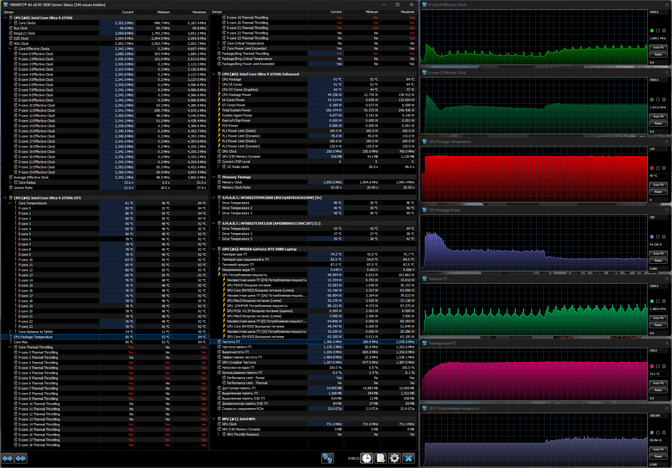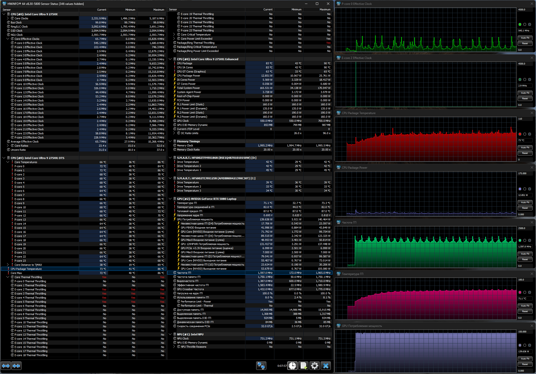 Напомним: используемая в данной модели дискретная видеокарта относится к серии Nvidia GeForce RTX 50 в версии для ноутбуков (архитектура Blackwell), для GeForce RTX 5080 Laptop ее производитель заявляет наличие 7680 ядер CUDA, 256-разрядную шину памяти с подключением 16 ГБ ОЗУ GDDR7, тактовую частоту (с ускорением) до 2287 МГц и потребление 80—150 Вт.