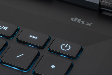 Клавиатура с механическими переключателями, островным расположением кнопок и полноценным цифровым блоком, но без выделенных Home, End, PgUp, PgDn, нет и правой клавиши Ctrl. Зато есть три отдельные кнопки для управления воспроизведением. Отступы по краям умеренные, по 22,5 мм, при этом большинство клавиш имеют обычный для ноутбуков размер 15,9×15,4 мм, кнопки цифрового блока такие же, лишь в крайнем правом ряду немного уменьшены. Функциональные клавиши еще поменьше (13,6×10 мм), левый Shift широкий — 37,9 мм, правый заметно меньше — 29,3 мм, а Enter имеет ширину 38,8 мм. Все четыре клавиши со стрелками имеют нормальный размер, но чуть сдвинуты к передней кромке корпуса.