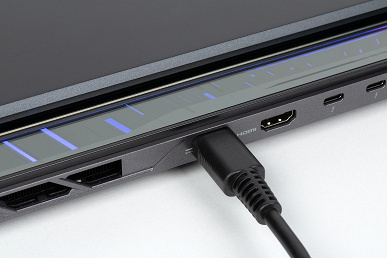 Справа — два индикатора (состояния батареи и включения ноутбука), два порта USB 3.2 Gen2 Type-A (один из них обеспечивает зарядку подключенных устройств при выключенном ноутбуке) и отверстие кенсингтонского замка.
