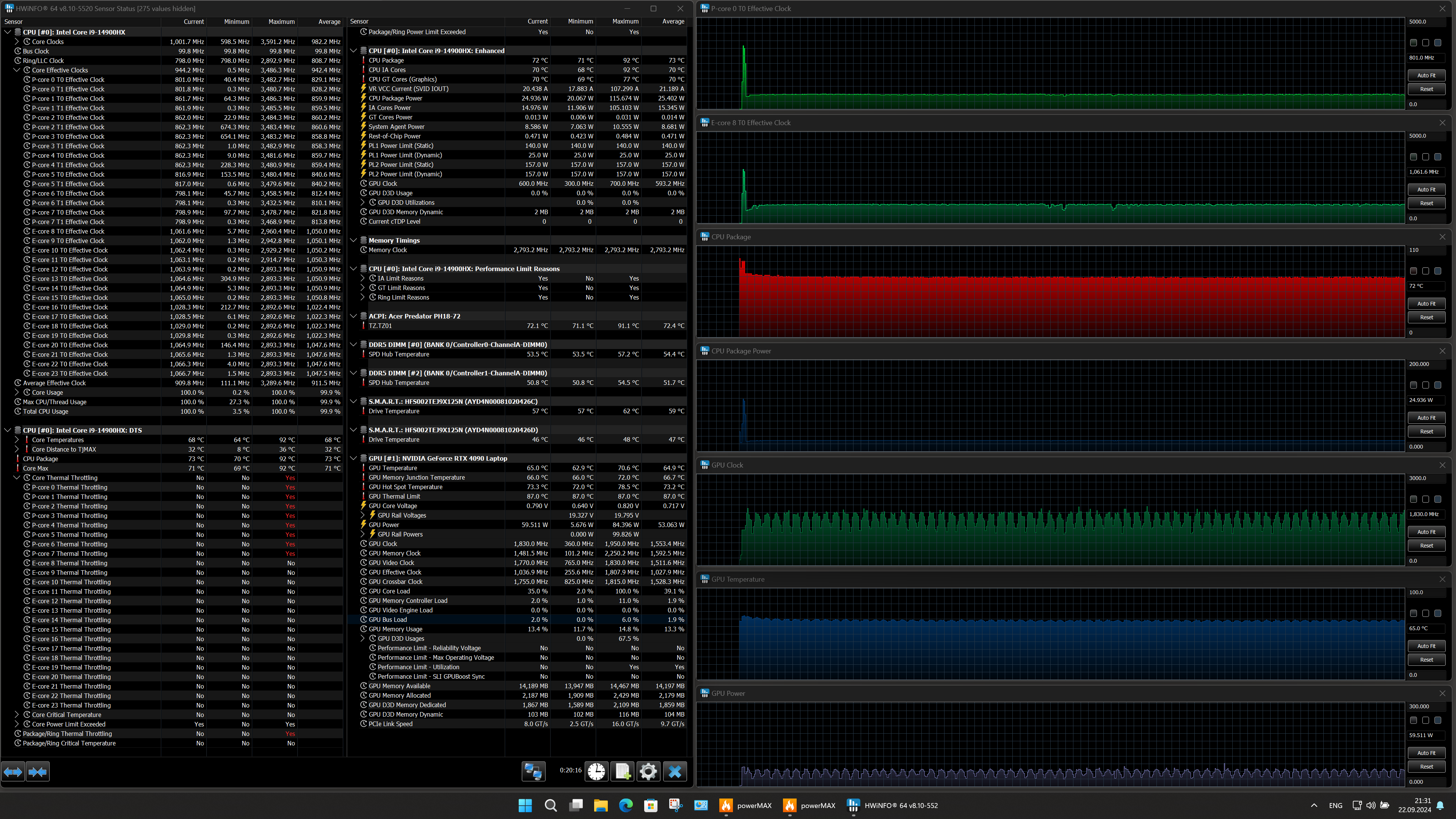 | Процессор | Intel Core i9-14900HX: 8 P-ядер/16 потоков (2,2/5,8 ГГц), 16 E-ядер (1,6/4,1 ГГц), TDP 45 Вт (45—55/157 Вт), Tjmax 100 °C | |