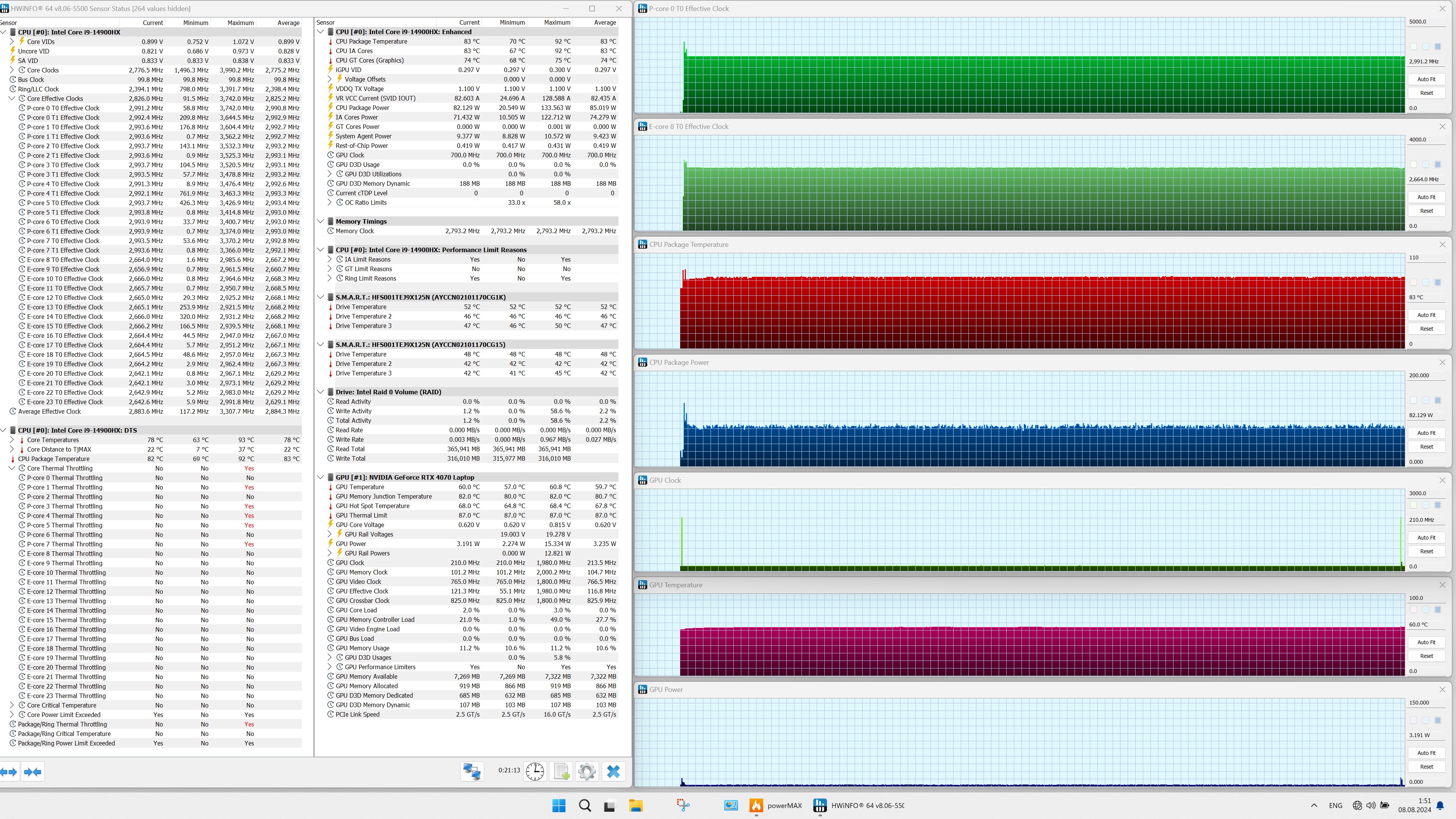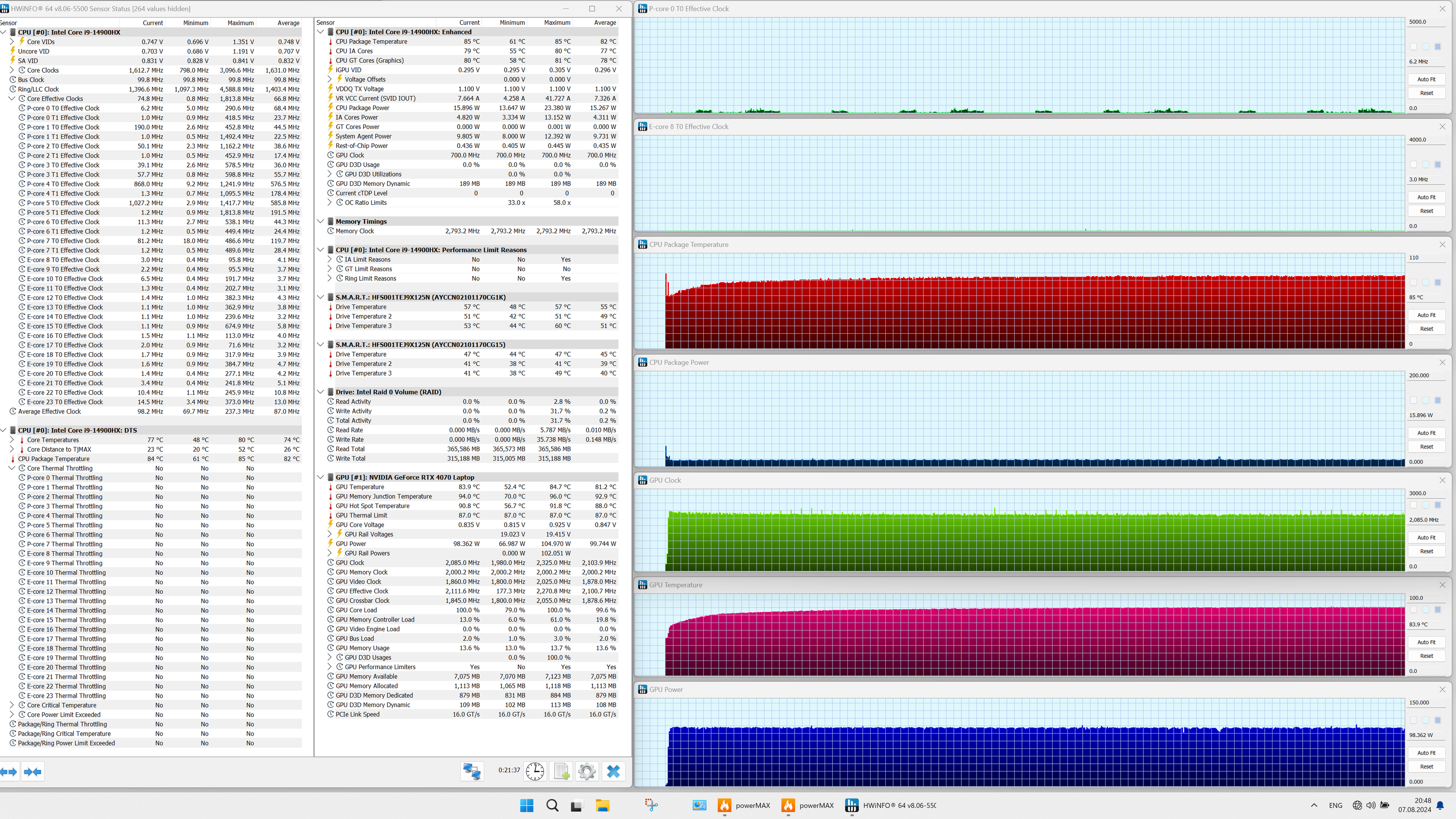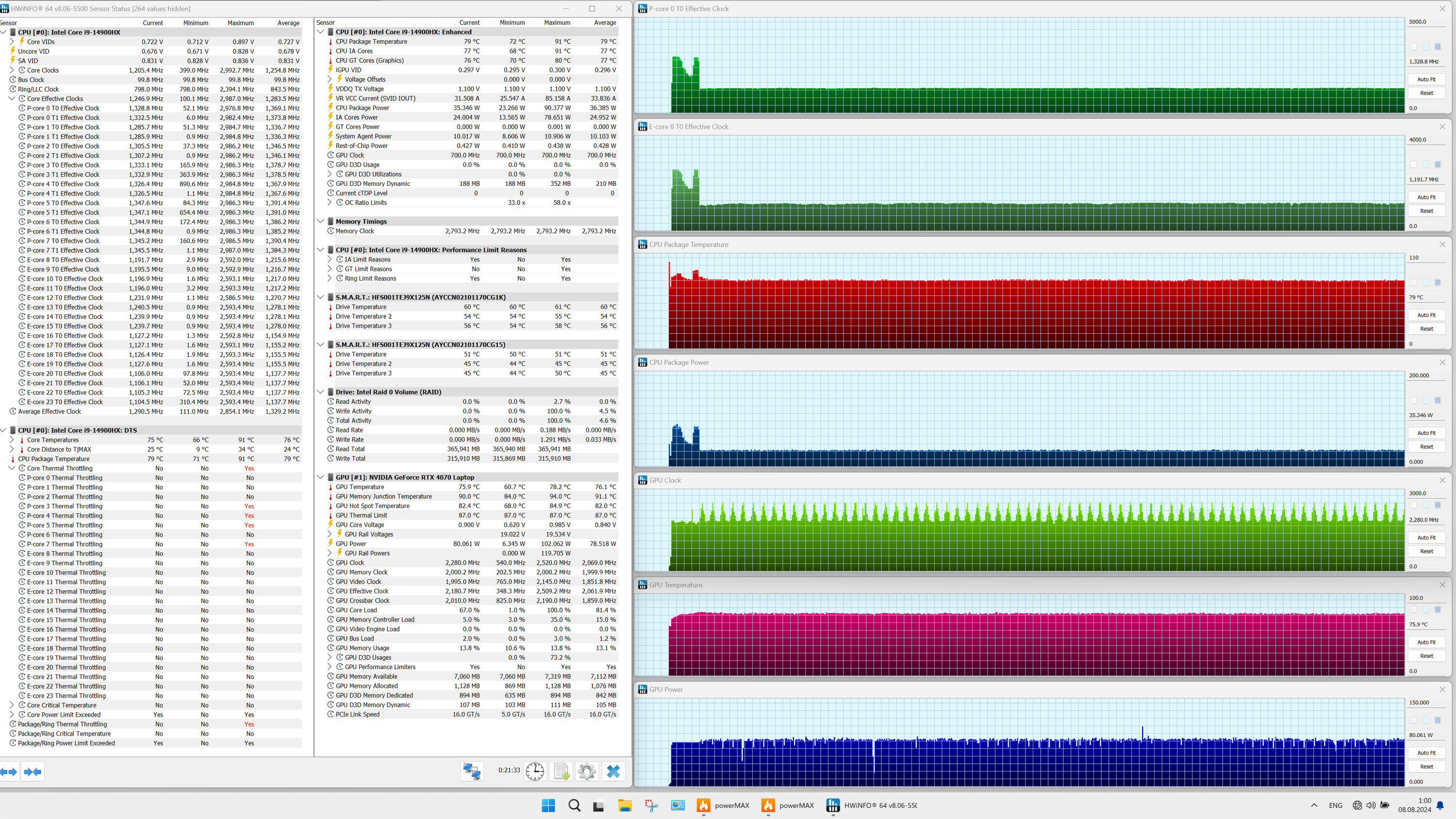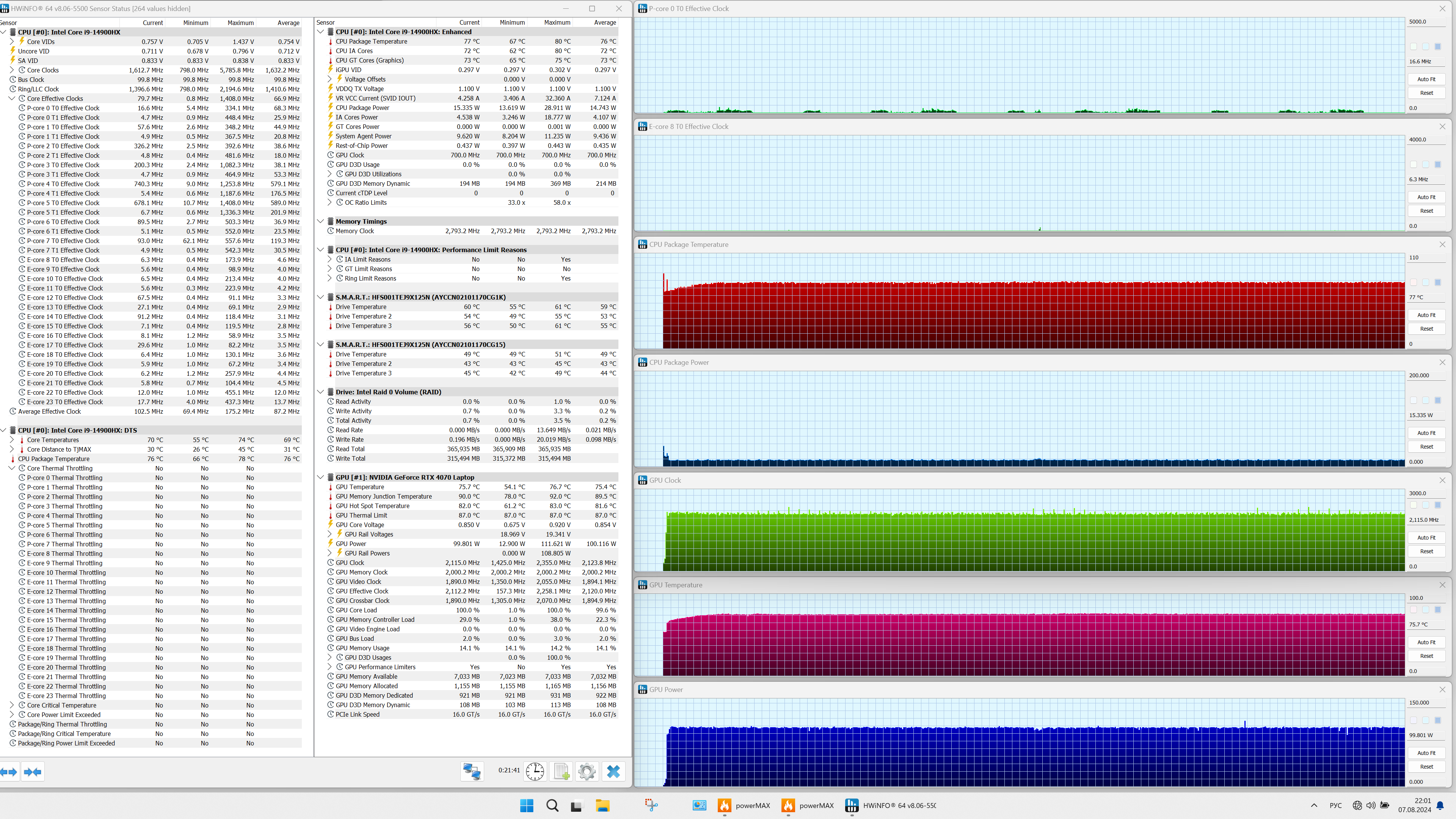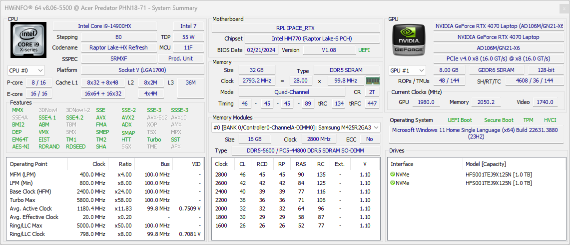 | Процессор | Intel Core i9-14900HX: 8 P-ядер/16 потоков (2,2/5,8 ГГц), 16 E-ядер (1,6/4,1 ГГц), TDP 45 Вт (45—55/157 Вт), Tjmax 100 °C | |