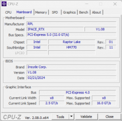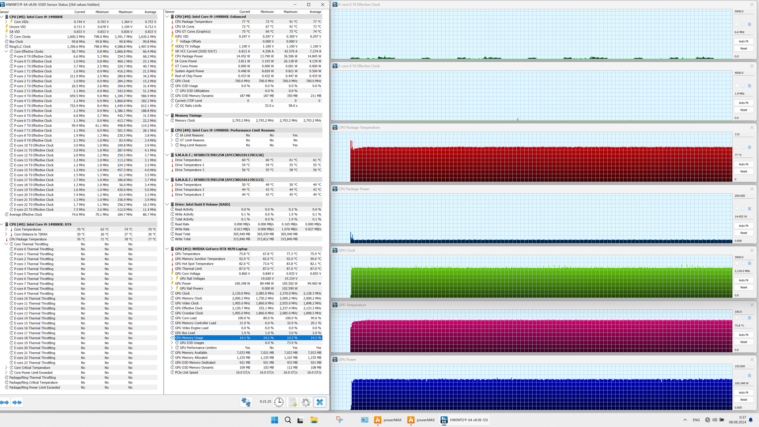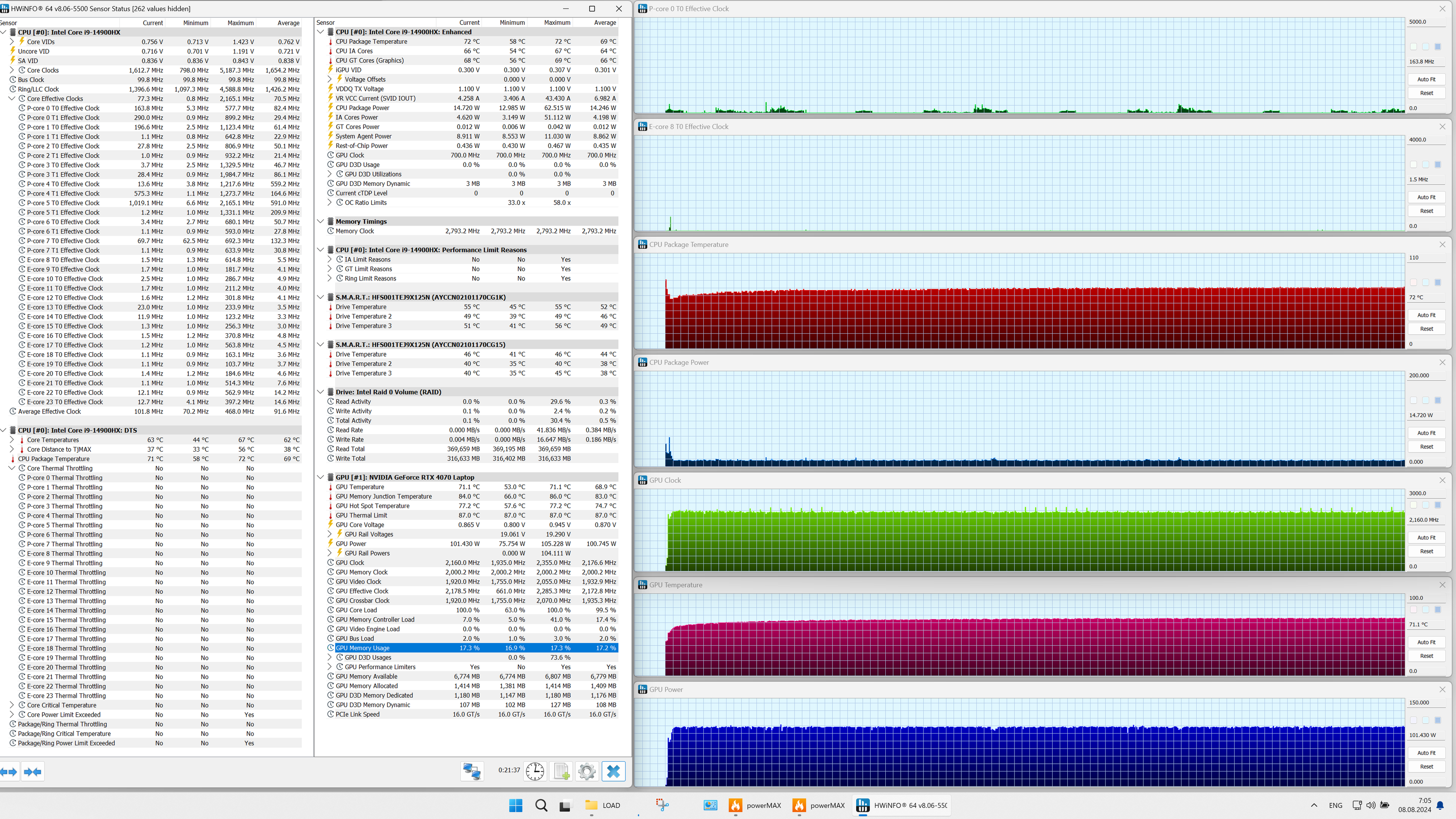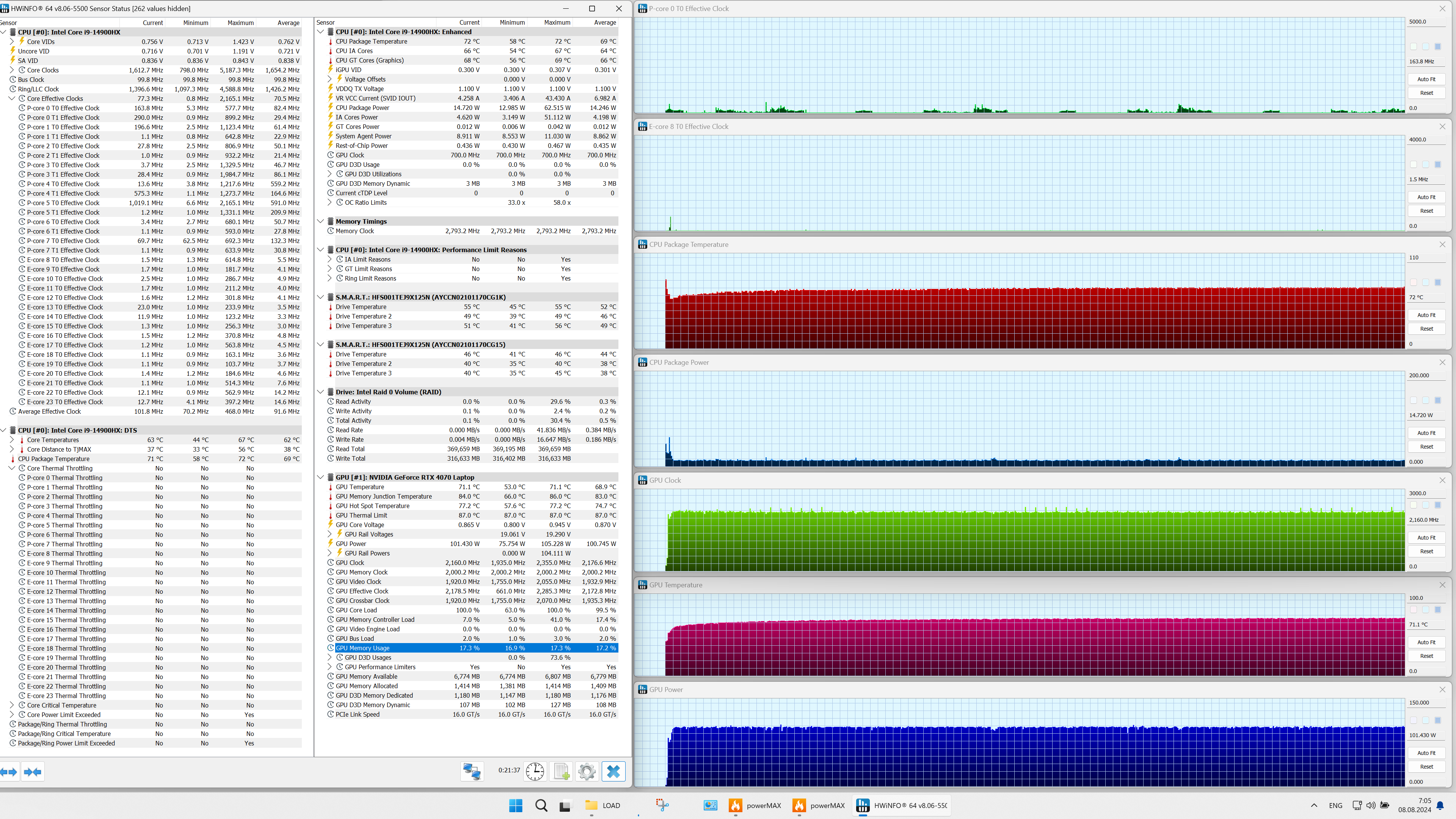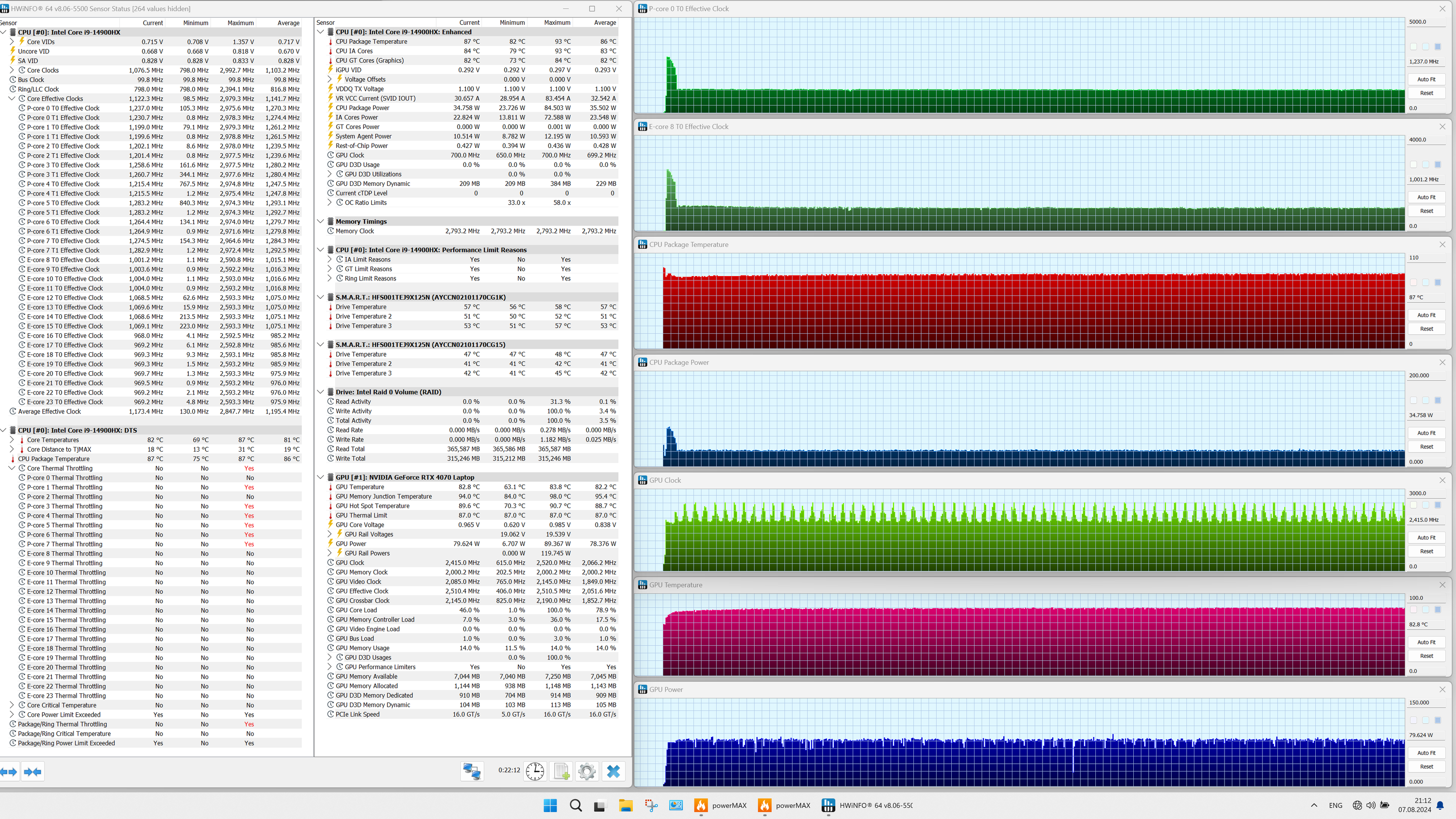 | Процессор | Intel Core i9-14900HX: 8 P-ядер/16 потоков (2,2/5,8 ГГц), 16 E-ядер (1,6/4,1 ГГц), TDP 45 Вт (45—55/157 Вт), Tjmax 100 °C | |