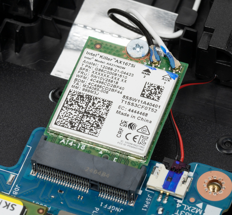 Адаптер беспроводной связи — трехдиапазонный (2,4/5/6 ГГц) Intel Killer AX1675i, или AX211NGW (Garfield Peak) по старой номенклатуре. Он соответствует классу Wi-Fi 6E, поддерживает стандарты связи 802.11ax и обеспечивает одновременный прием и передачу сигнала с помощью двух антенн при множественных одновременных подключениях (2×2 MIMO), то есть представляет собой вполне современное, хорошо проверенное и отлично себя зарекомендовавшее устройство.