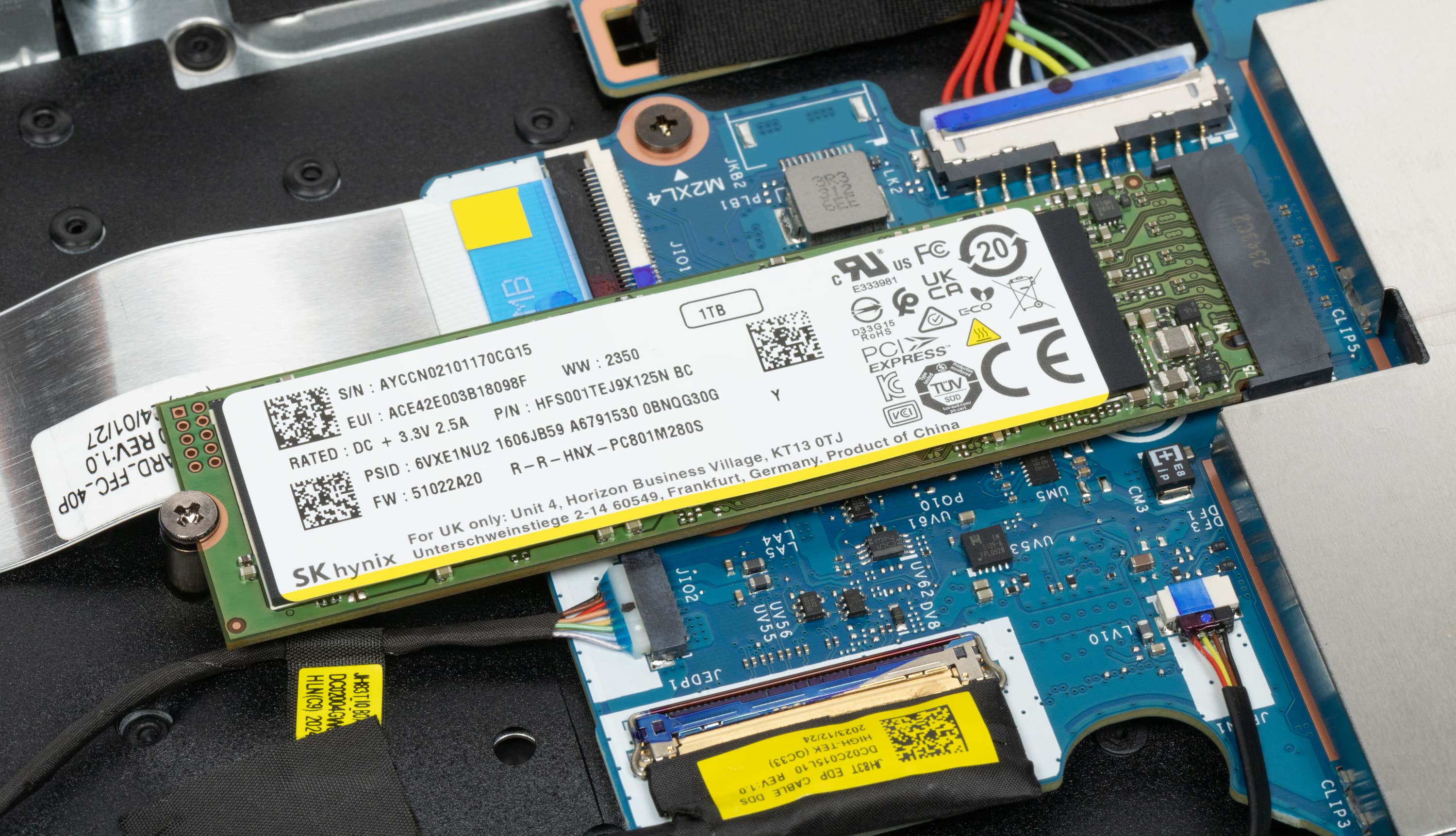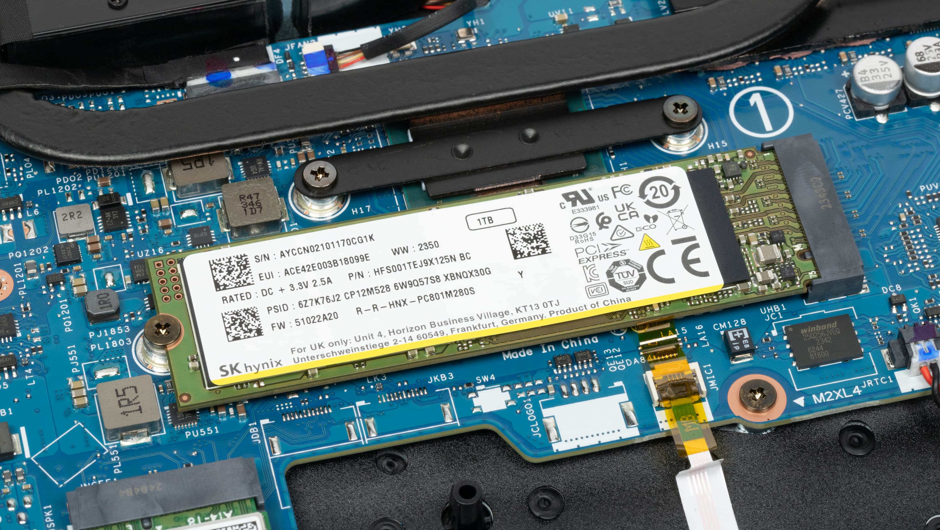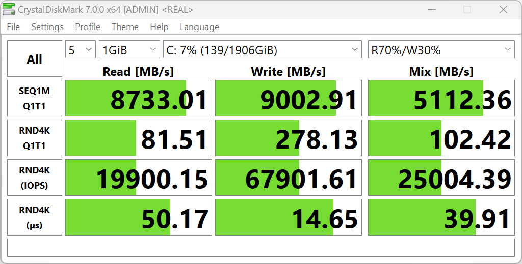 Как уже упоминалось выше, системный накопитель представляет собой массив RAID0 из двух физических NVMe-устройств SK Hynix (HFS001TEJ9X125N) вместимостью по 1 ТБ каждый (интерфейс PCIe 4.0 ×4). Поскольку массив RAID0 подразумевает запись и чтение данных с участием обоих SSD одновременно, то скорости этих операций (в идеале) удваиваются, равно как и емкость логического тома. Впрочем, из-за отсутствия резервирования выход из строя любого из накопителей означает утрату всего, что хранилось в массиве. Однако мы вслед за производителем будем уповать на высокую надежность современных SSD при наработке на отказ.