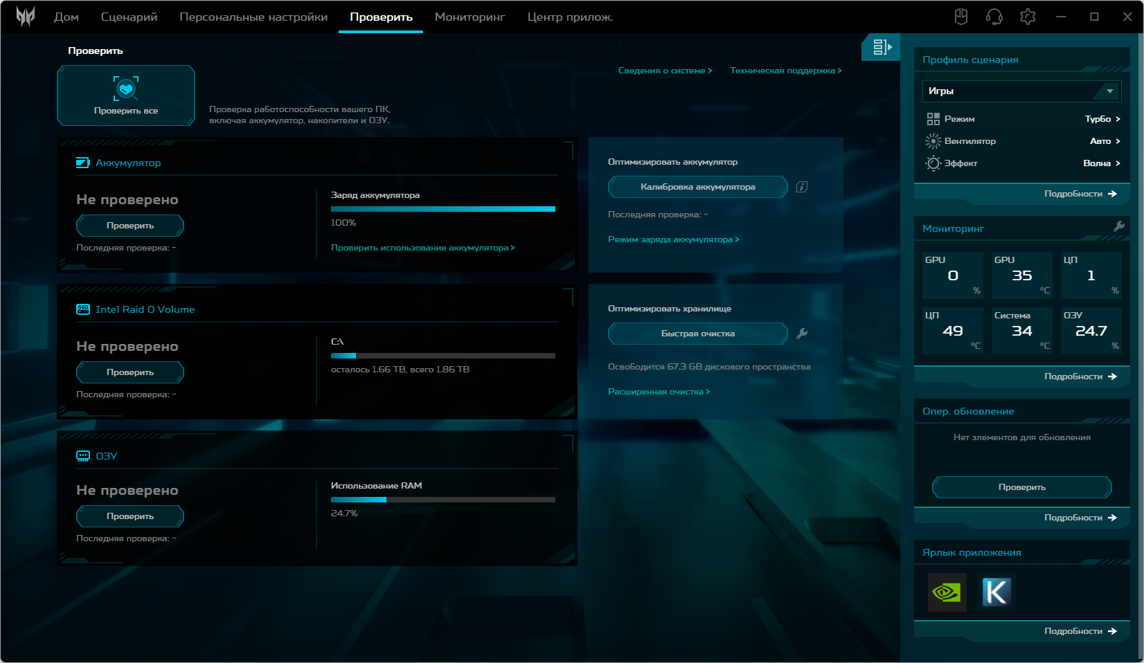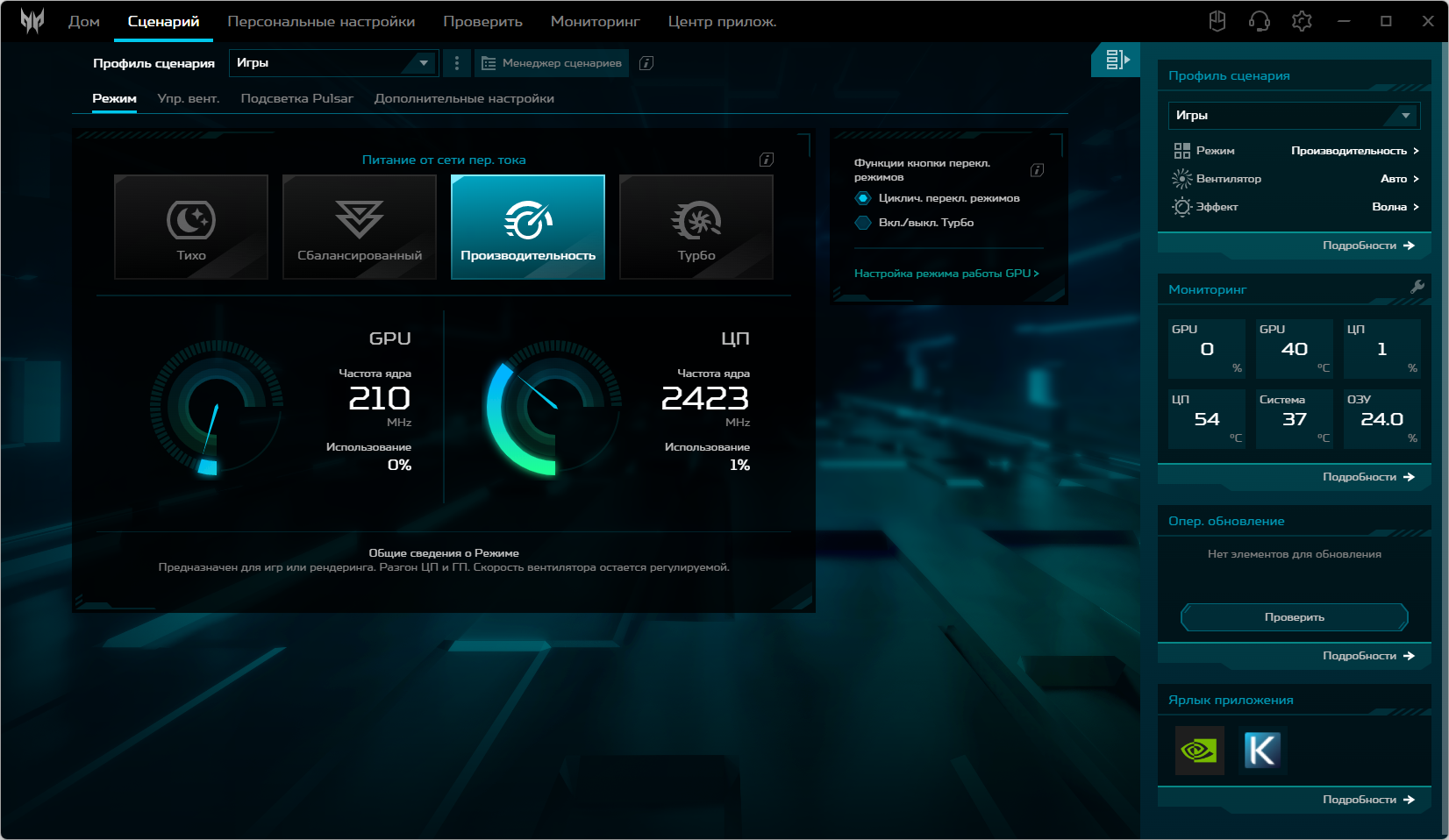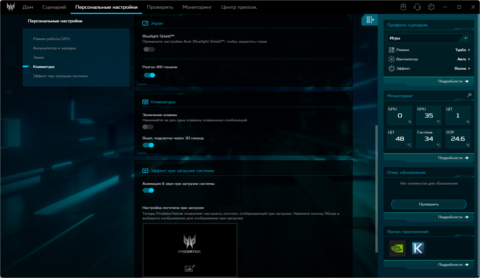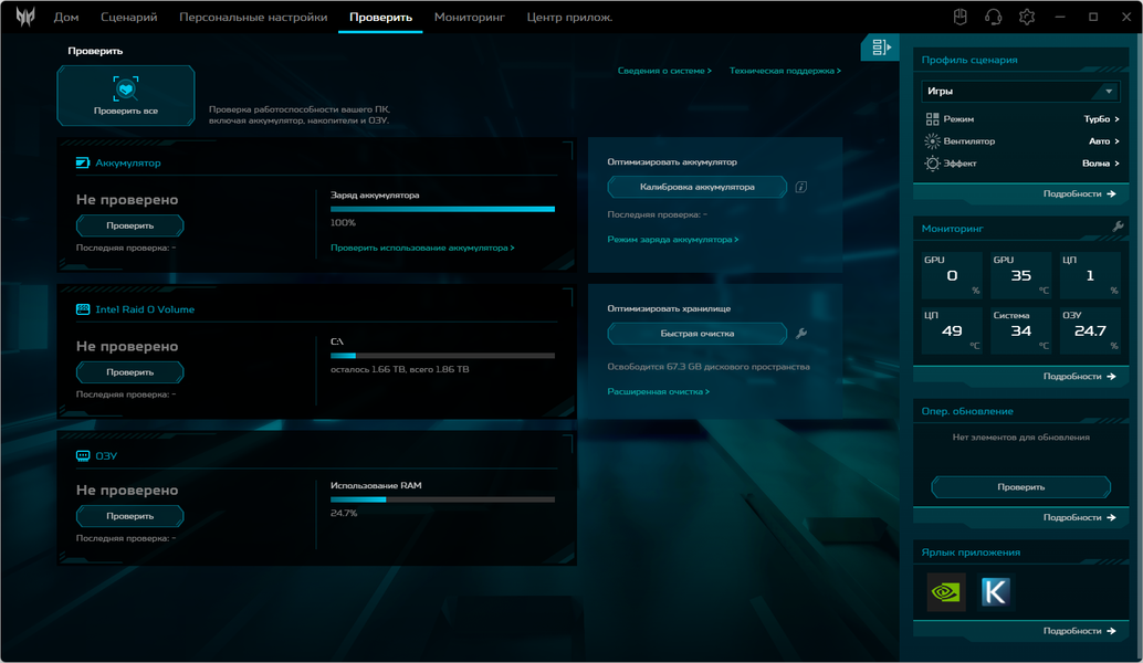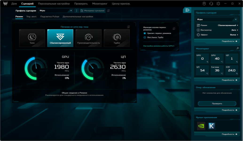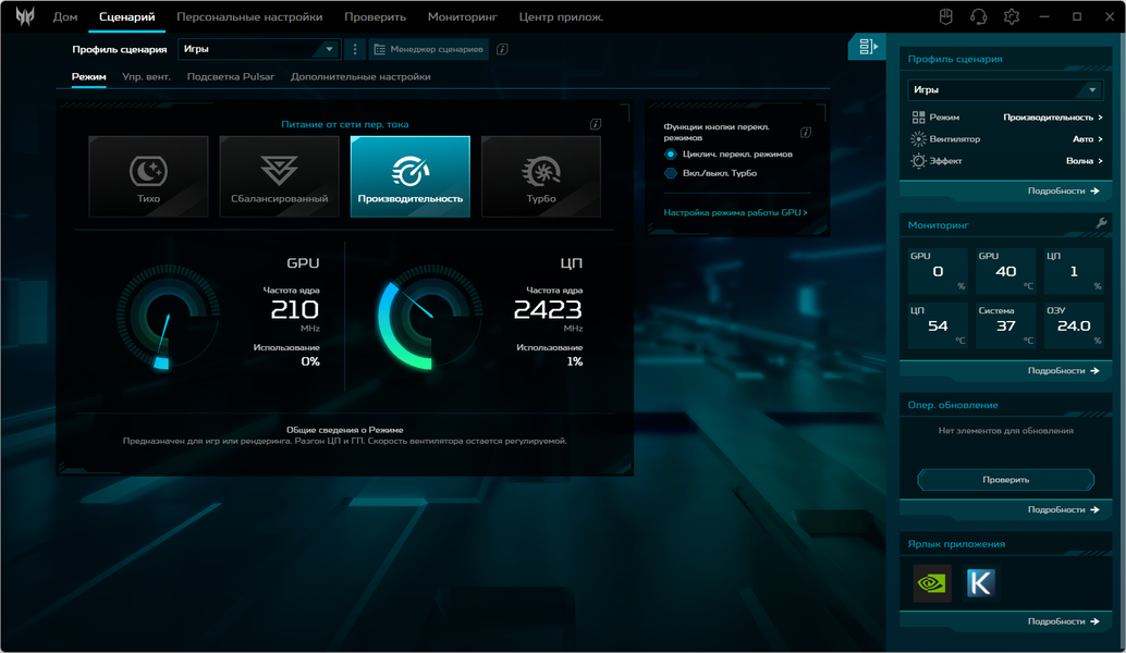 Ноутбук Acer Predator Helios Neo 18 PHN18-71 поставляется с Windows 11, триал-версией Microsoft Office 365, сетап-инициатором Яндекс и фирменной утилитой PredatorSense. Последняя представляет наибольшую ценность при испытаниях машины, поскольку дает возможность настраивать разные параметры и выбирать сценарии (профили, пресеты) работы.