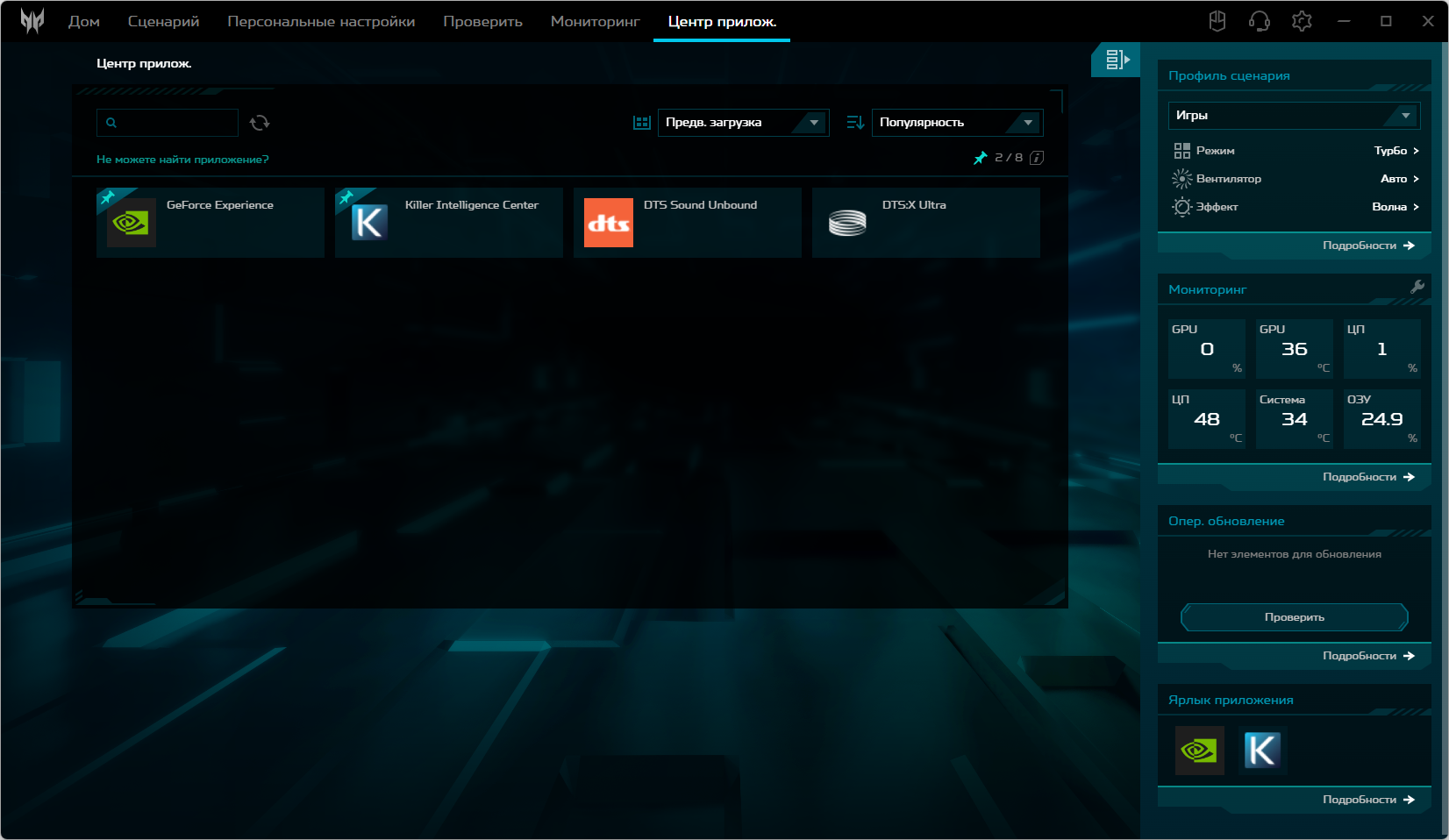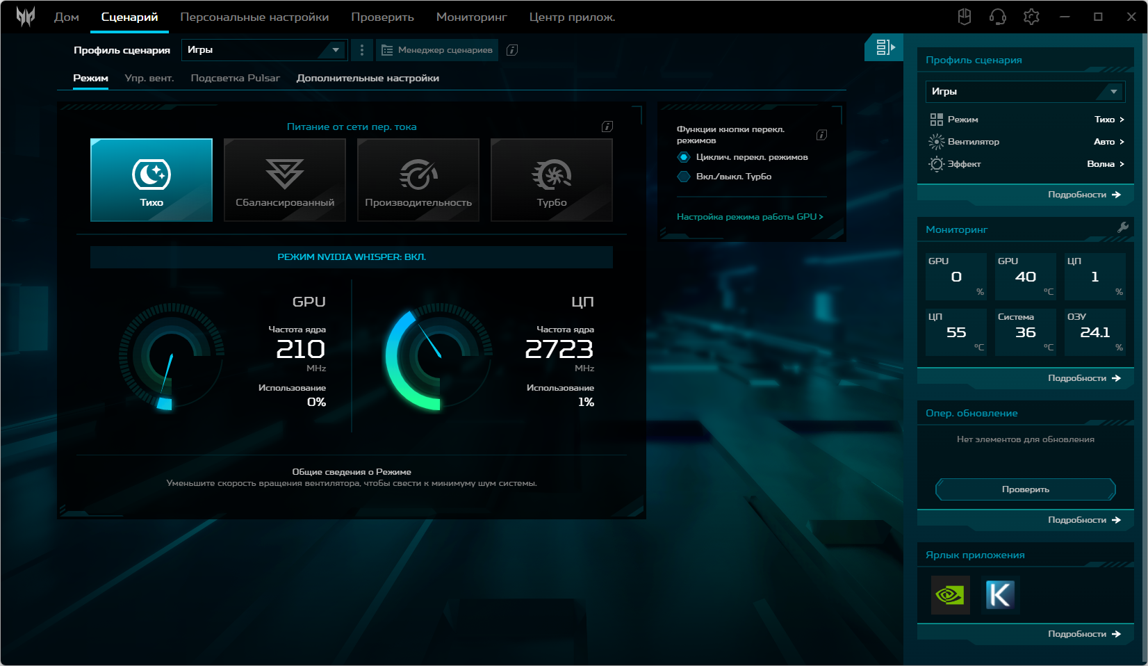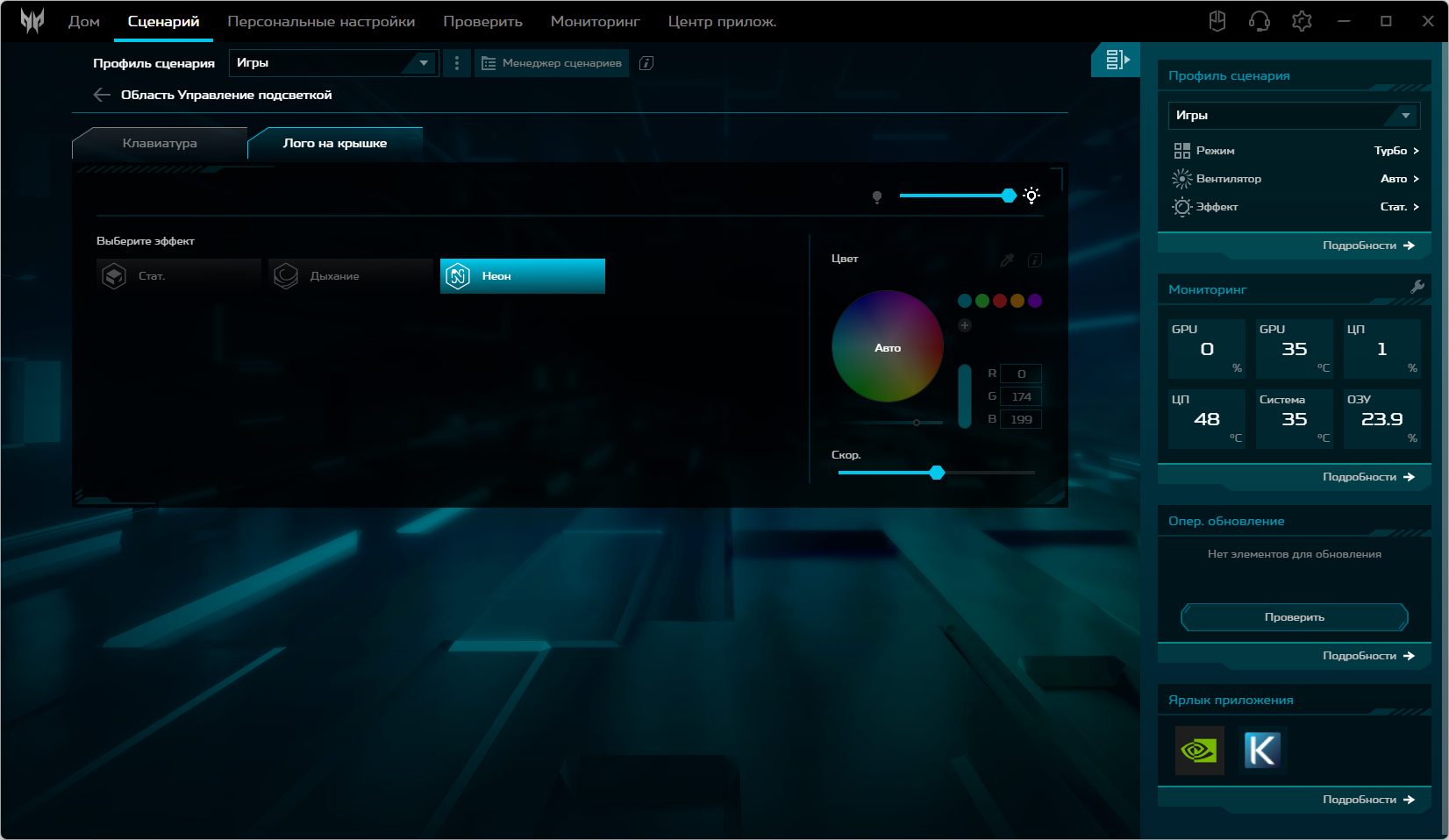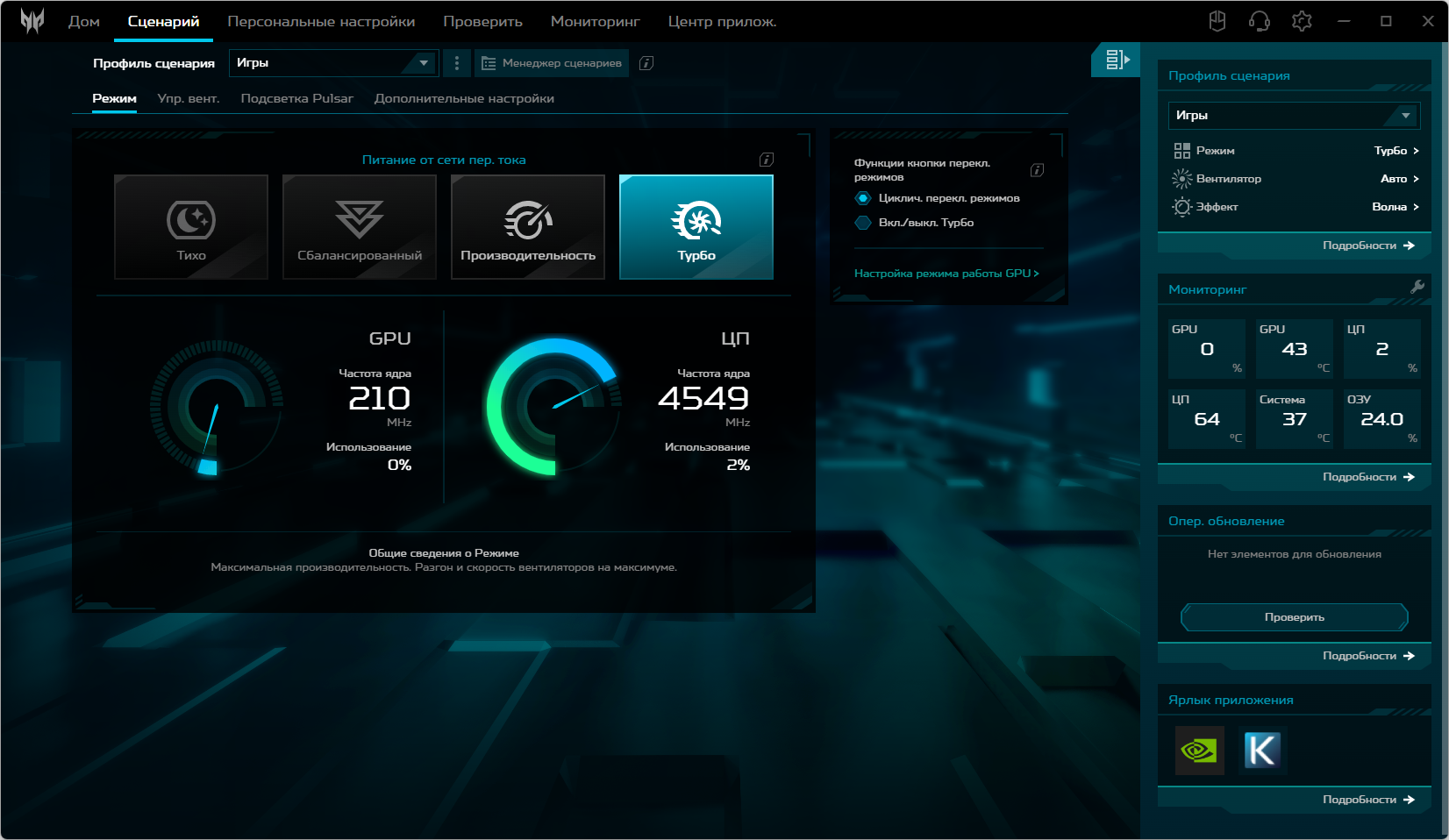 Ноутбук Acer Predator Helios Neo 18 PHN18-71 поставляется с Windows 11, триал-версией Microsoft Office 365, сетап-инициатором Яндекс и фирменной утилитой PredatorSense. Последняя представляет наибольшую ценность при испытаниях машины, поскольку дает возможность настраивать разные параметры и выбирать сценарии (профили, пресеты) работы.