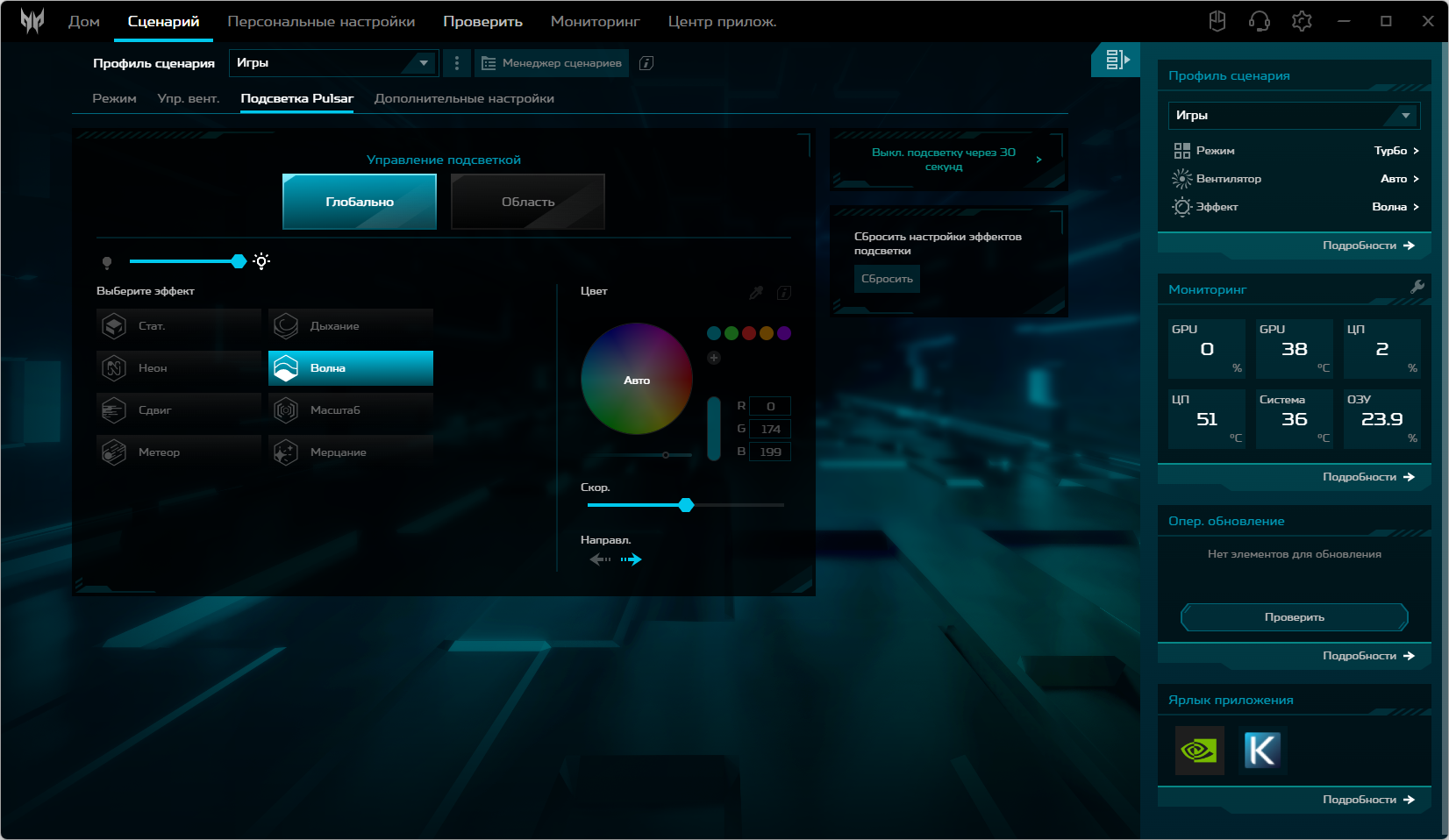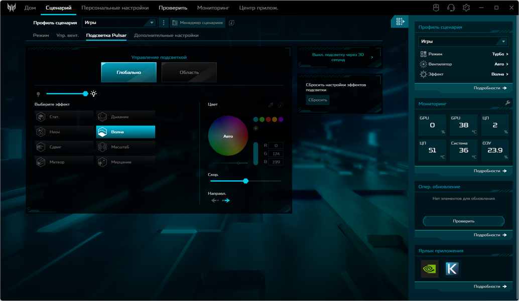 Подраздел «Подсветка Pulsar» позволяет выбирать цвет и схему подсветки клавиатуры.