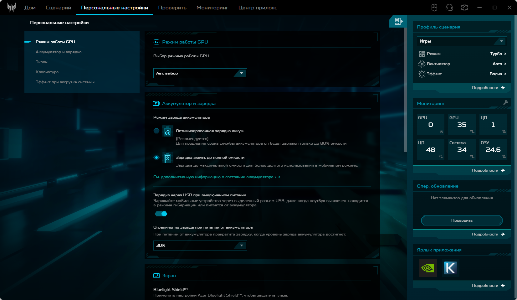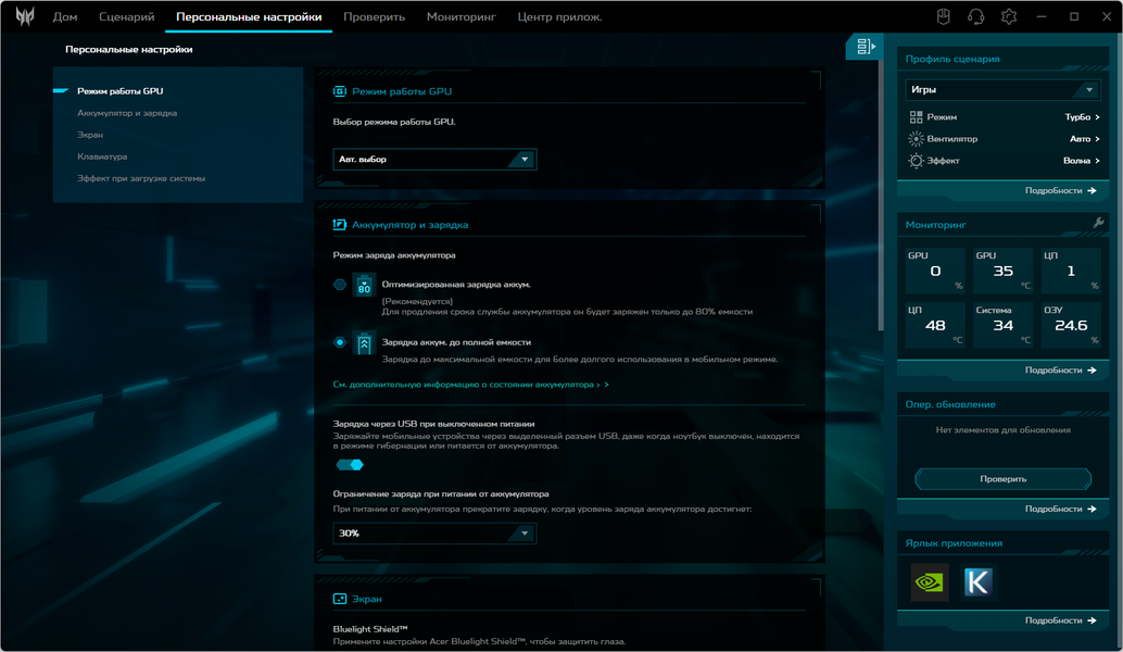 В числе прочего доступны установки режимов работы видеокарты, зарядки аккумулятора, экрана и клавиатуры.