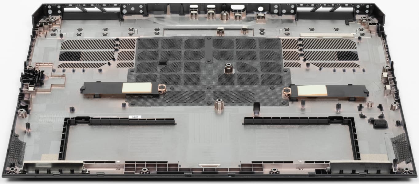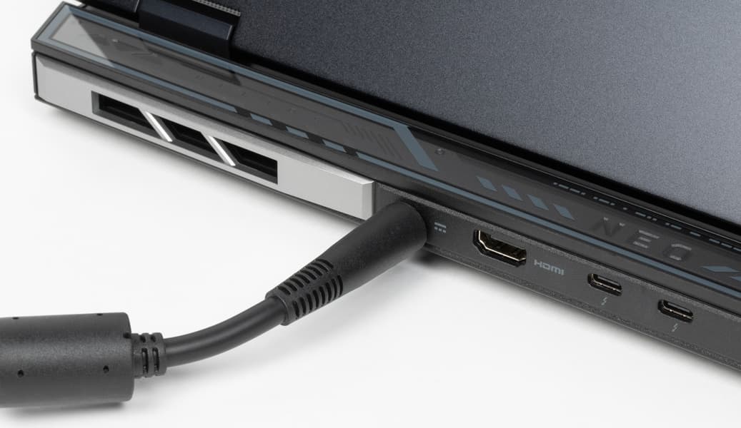На задней панели слева и справа расположены решетки, через которые из внутреннего объема ноутбука наружу эвакуируется нагретый воздух. Между этими решетками помещаются в ряд коаксиальный разъем для подключения адаптера питания, видеовыход HDMI и два разъема USB Type-C (Thunderbolt 4).