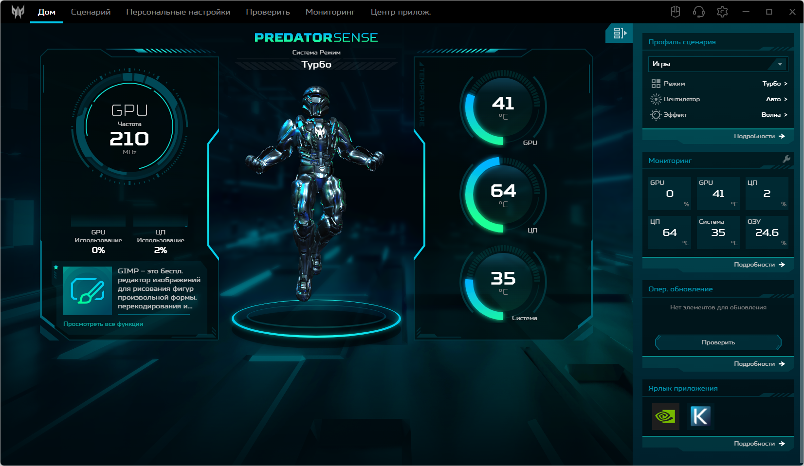 Начальный экран приложения радует 3D-анимированной фигуркой и анимированными же индикаторами тактовой частоты графического процессора и показателями загрузки GPU и CPU слева, а также показателями нагрева обоих вычислителей и температуры внутри системного блока справа.