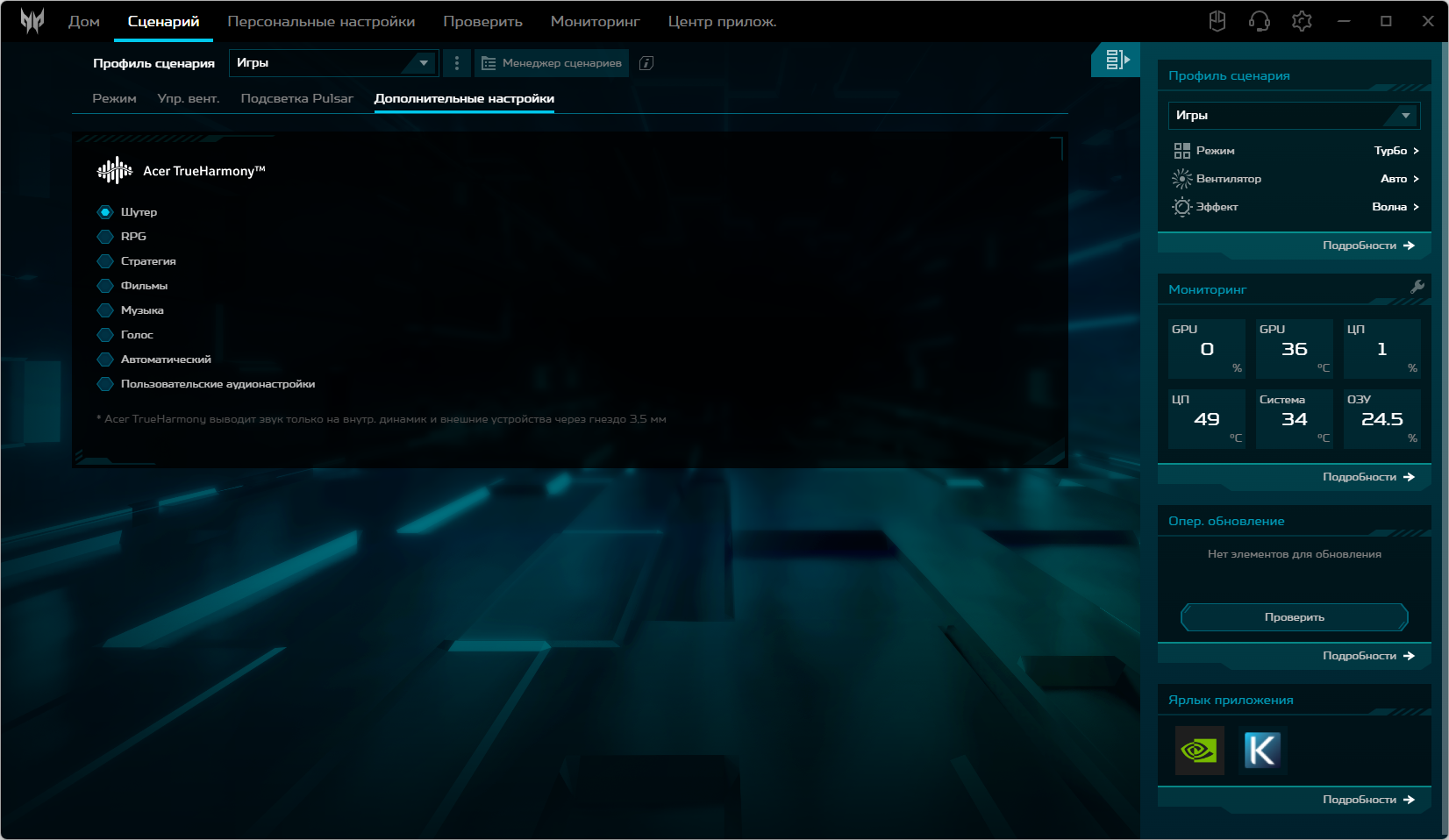 Среди дополнительных настроек имеются опции работы аудиотюнера Acer TrueHarmony, которые обладают желаемой спецификой для игр разных жанров, просмотра фильмов, воспроизведении музыки и голоса.