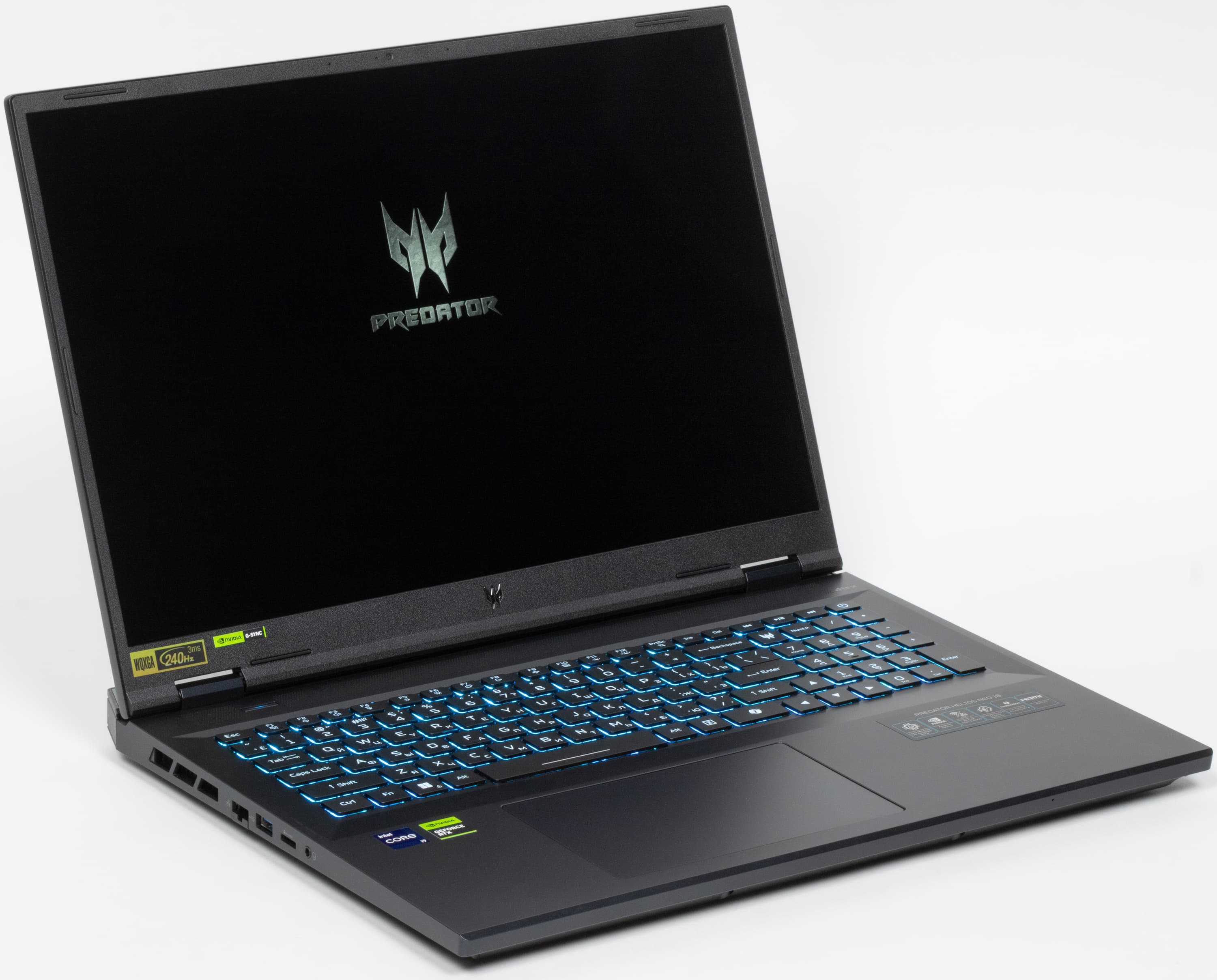 Максимальный угол раскрытия Acer Predator Helios Neo 18 составляет 144°. В закрытом состоянии крышка удерживается без замков или магнитов, только за счет петель и доводчика. При закрывании и открывании крышки одной рукой корпус срабатывает как противовес, поэтому машина не сдвигается.
