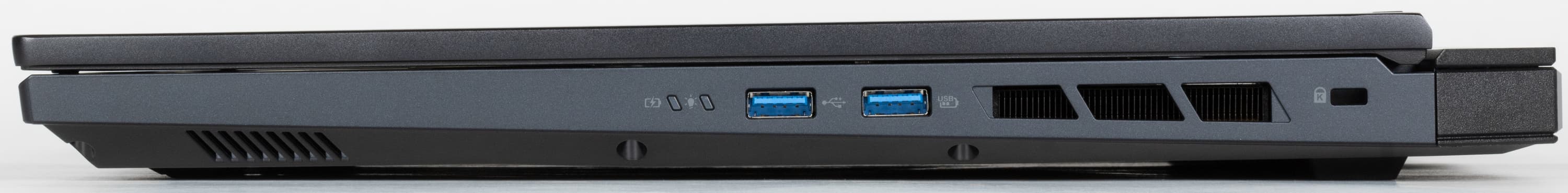 Справа расположены сигнальные светодиоды, порты USB 3.2 Gen2 Type-A, боковая решетка выходного тракта системы охлаждения и отверстие кенсингтонского замка.
