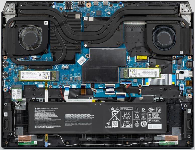 Наиболее приметные узлы конструкции — система охлаждения, блок со слотами SO-DIMM (на фото скрыт под накладкой) и аккумулятор. Системная плата дополнена левым сателлитом (на фото — справа), где установлены розетка RJ-45, порт USB Type-A, картовод и комбинированный аудиоразъем для гарнитуры. Аппаратная модернизация предусматривает возможность изменения конфигурации оперативной памяти, замену беспроводного адаптера и аккумулятора. В принципе, можно поменять и оба накопителя, заменив их более вместительными, но стоит ли это делать, не ясно.