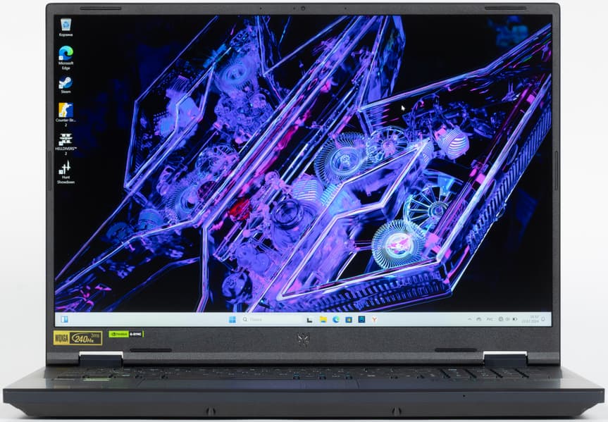 Наконец-то дождались: экран 18 дюймов (240 Гц, максимальная яркость 510 кд/м²), топовый процессор Intel Core i9-14900HX, достойная видеокарта Nvidia GeForce RTX 4070 Laptop, 32 ГБ ОЗУ и сверхбыстроходный системный накопитель в виде массива Stripe (RAID0), построенный из двух SSD по 1 ТБ с двухкратным выигрышем в скорости чтения и записи данных по сравнению с составляющим его устройствами по отдельности. Еще из комплекта диковин: два сверхвысокоскоростных порта Thunderbolt 4 (40 Гбит/с) плюс два просто высокоскоростных USB 3.2 Gen2 (10 Гбит/с). Таким образом, перед нами настоящий монстр игрового спецназа. Жаль, что Ethernet лишь гигабитный, зато аккумулятор дает возможность 3 часа 47 минут работать с текстами либо почти 3,5 часа смотреть кино — для мощной игровой портативной машины это очень неплохо. При этом особую важность имеет и то, что емкость батареи восполняется от 0 до 50% всего за полчаса, а от 0 до 80% — за 45 минут. Производительность в реальных приложениях мотивирует геймера заняться еще и креативной деятельностью, поскольку ноутбуку по плечу самые сложные задачи (создание и обработка медиаконтента, научные вычисления и, весьма вероятно, 3D-моделирование и цифровая анимация), и в подобном амплуа опять-таки козырем становится гигантский экран, возможность подключить до трех внешних мониторов одновременно и использовать внешние хранилища медиаконтента, подключенные к 40- и 10-гигабитным портам. Со всеми играми нашего испытательного набора машина справилась хорошо, но Cyberpunk 2077 с RT без DLSS — распространенная проблема — чуть подпортил картину. Тем не менее, играбельность мы признаем отличной и настоятельно рекомендуем присмотреться к новинке как вероятному кандидату для приобретения. С такой, как у него, суммой достоинств даже цена 249 тысяч рублей (на момент подготовки настоящего обзора) не кажется чрезмерной.