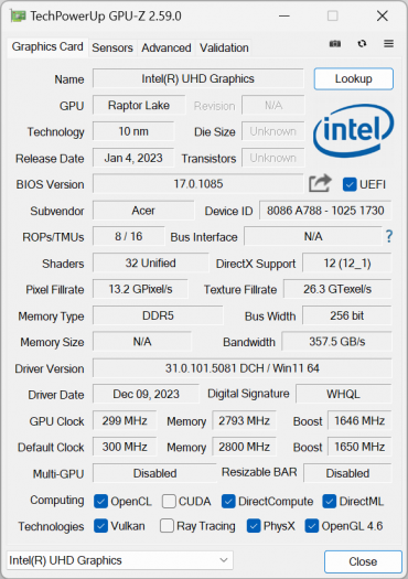 У главного вычислителя Acer Predator Helios Neo 18 PHN18-71 имеется интегрированное графическое ядро Intel UHD Graphics (32 исполнительных блока, тактовая частота 1,65 ГГц), но для игр и приложений, умеющих задействовать дискретный видеоускоритель, установлена видеокарта Nvidia GeForce RTX 4070 Laptop с 8 ГБ видеопамяти GDDR6.