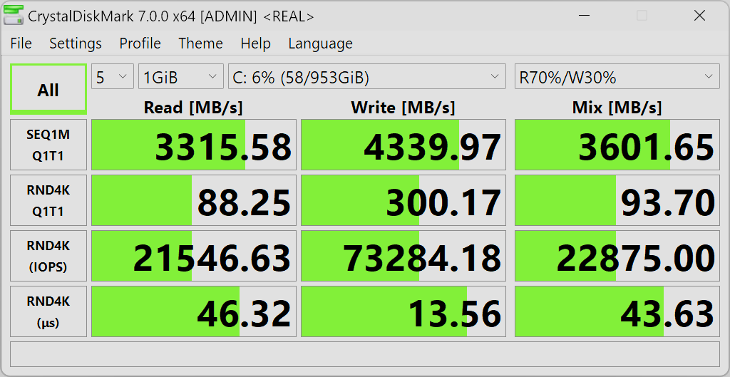 Под этими «доспехами» видна маркировка: Western Digital PC SN740 (вместимость 1 ТБ). При испытаниях средствами популярной утилиты CrystalDiskMark видим следующую картину: