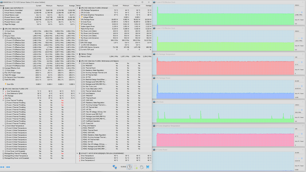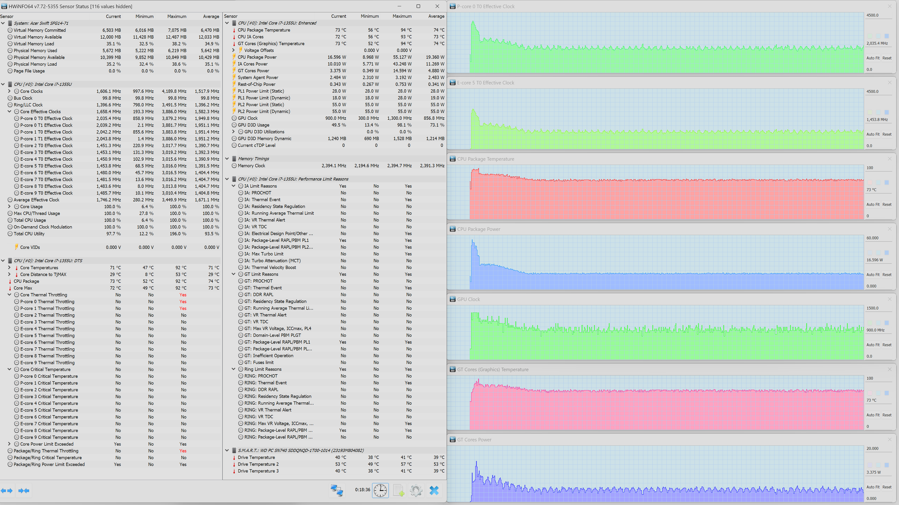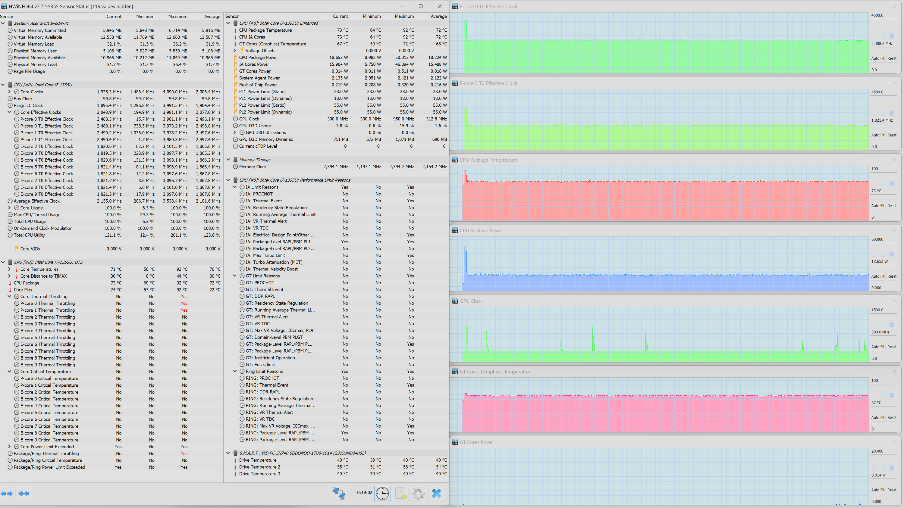В ноутбуке Acer Swift Go 14 установлен мобильный процессор со сверхнизким потреблением Intel Core i7-1355U. Он содержит два P-ядра, работающих в четыре потока с тактовой частотой до 5 ГГц, и восемь однопотоковых E-ядер, работающих с тактовой частотой до 3,7 ГГц. В соответствии с теплопакетом потребление составляет в стабильном режиме до 15 Вт, а при разгоне — до 55 Вт. В ходе наших стресс-тестов под максимальной нагрузкой CPU отбирал при стабильной работе 19 Вт, что почти на треть превышает паспортные значения, а при разгоне — 55 Вт (при нагрузке одновременно на CPU и интегрированную графику), то есть точь-в-точь столько, сколько обещано характеристиками.