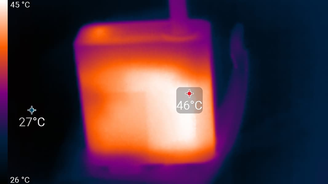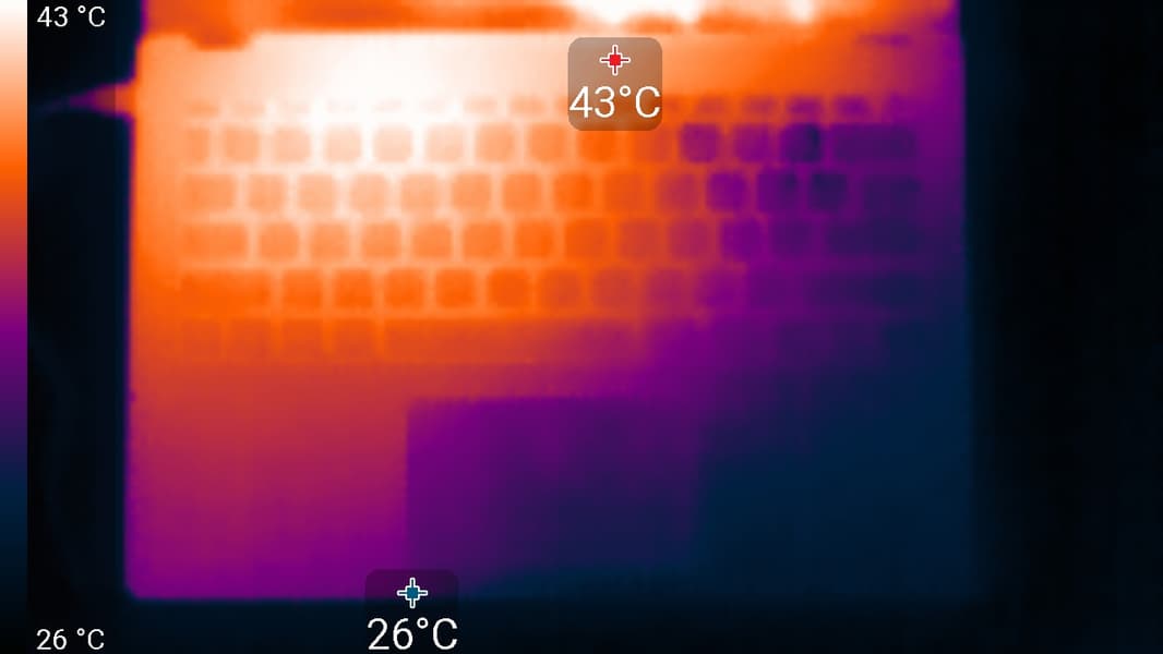Под максимальной нагрузкой работать с клавиатурой более-менее комфортно, так как места под запястьями практически не нагреваются (нагрев под левым запястьем по факту умеренный). Держать ноутбук на коленях при этом неприятно — днище над левым коленом существенно греется. Блок питания греется не очень сильно, но все же лучше, чтобы при долговременной работе с большой производительностью он не был ничем накрыт.